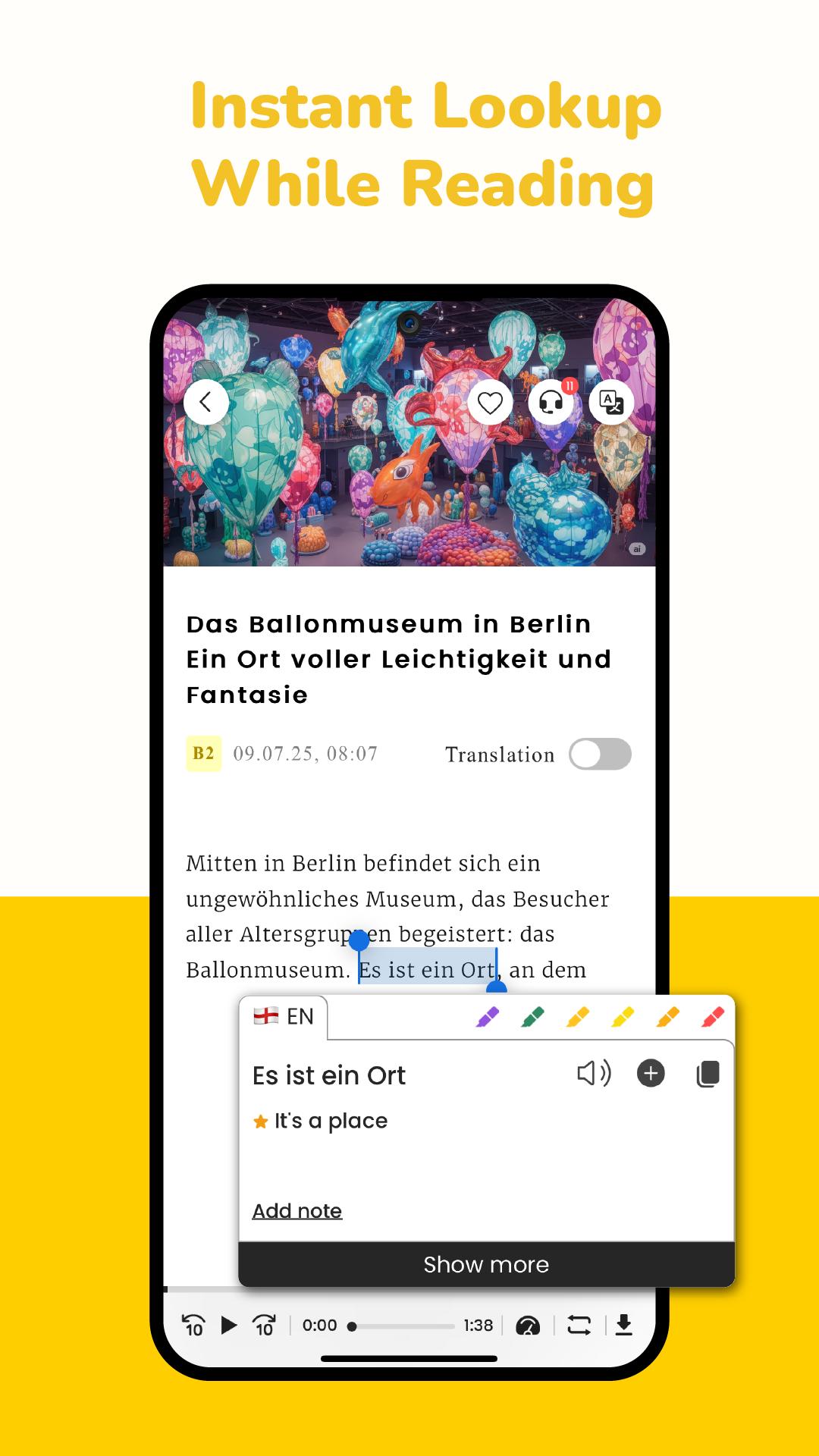 Todaii German はドイツ語の記事を効果的に読解する方法を提供します。 単語検索機能を記事に直接統合することで、記事を深く理解し、語彙力と読解力を高めるのに役立ちます。 1日わずか20分で、1か月後には大きな進歩を遂げます。