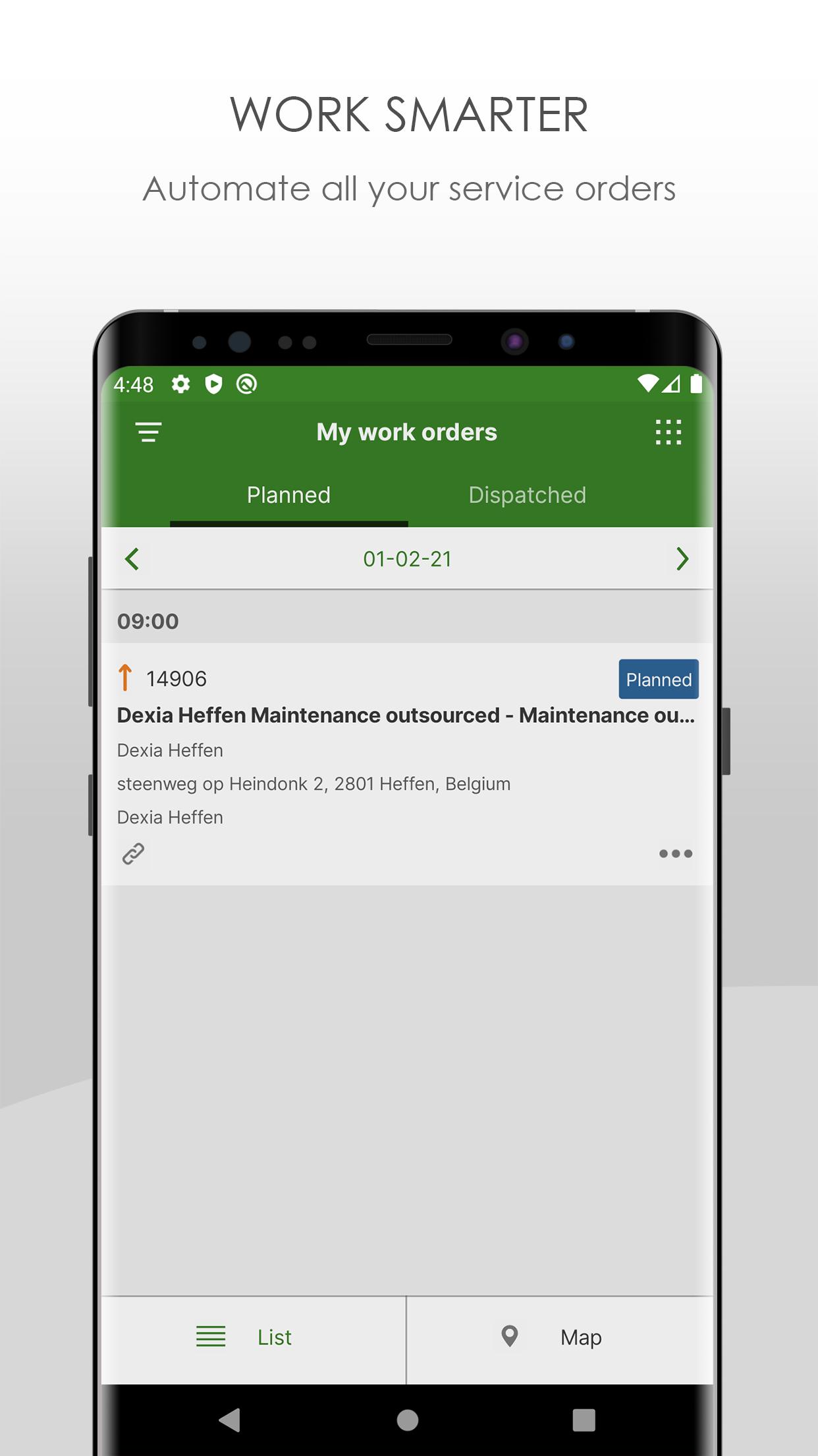 Additional features include viewing and completing service orders, managing inspection reports and audits, handling grouped work orders, managing stock locations, and communicating easily with customers and colleagues. The app also supports incident reporting, timesheet registration, integrated navigation, and track & trace.