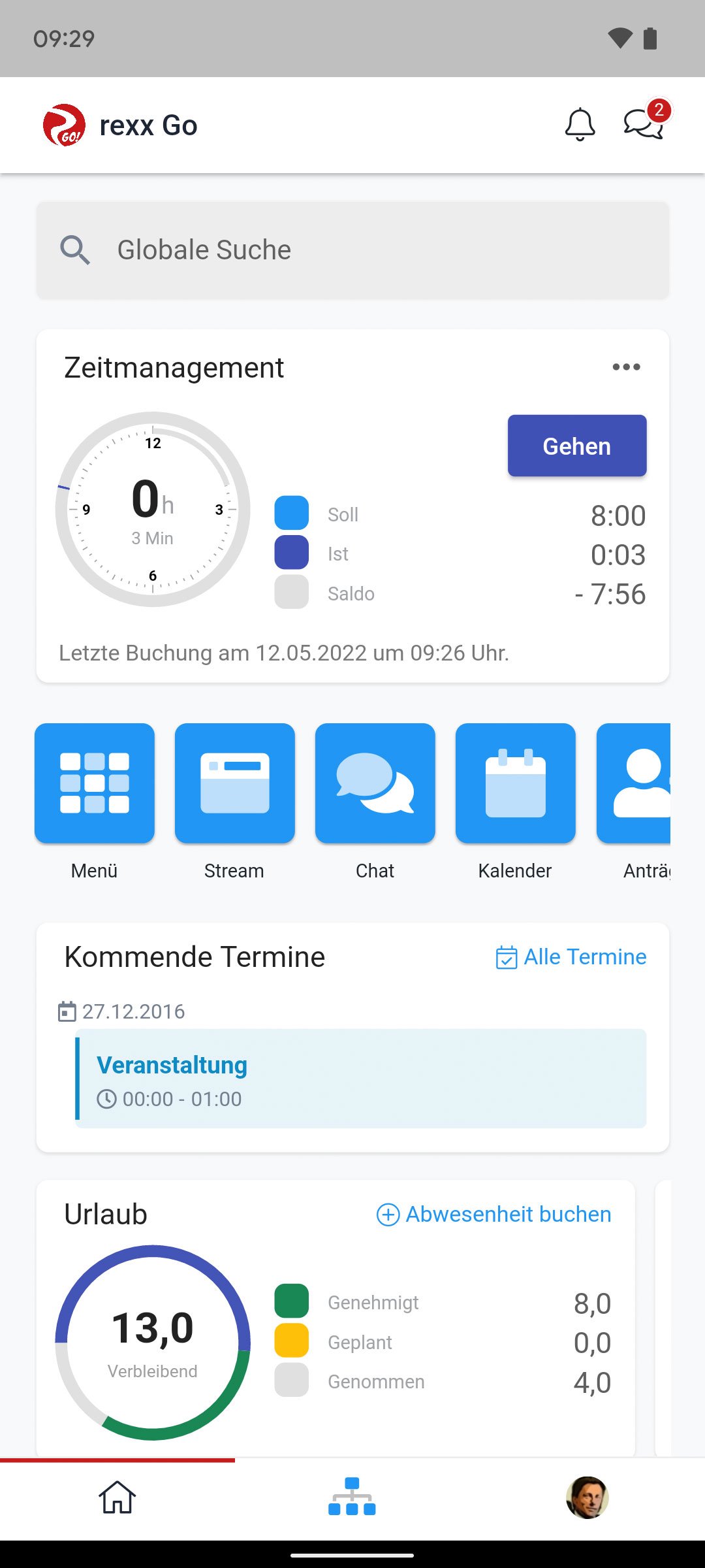 - Start screen with widgets for time recording and absences incl. quick overviews