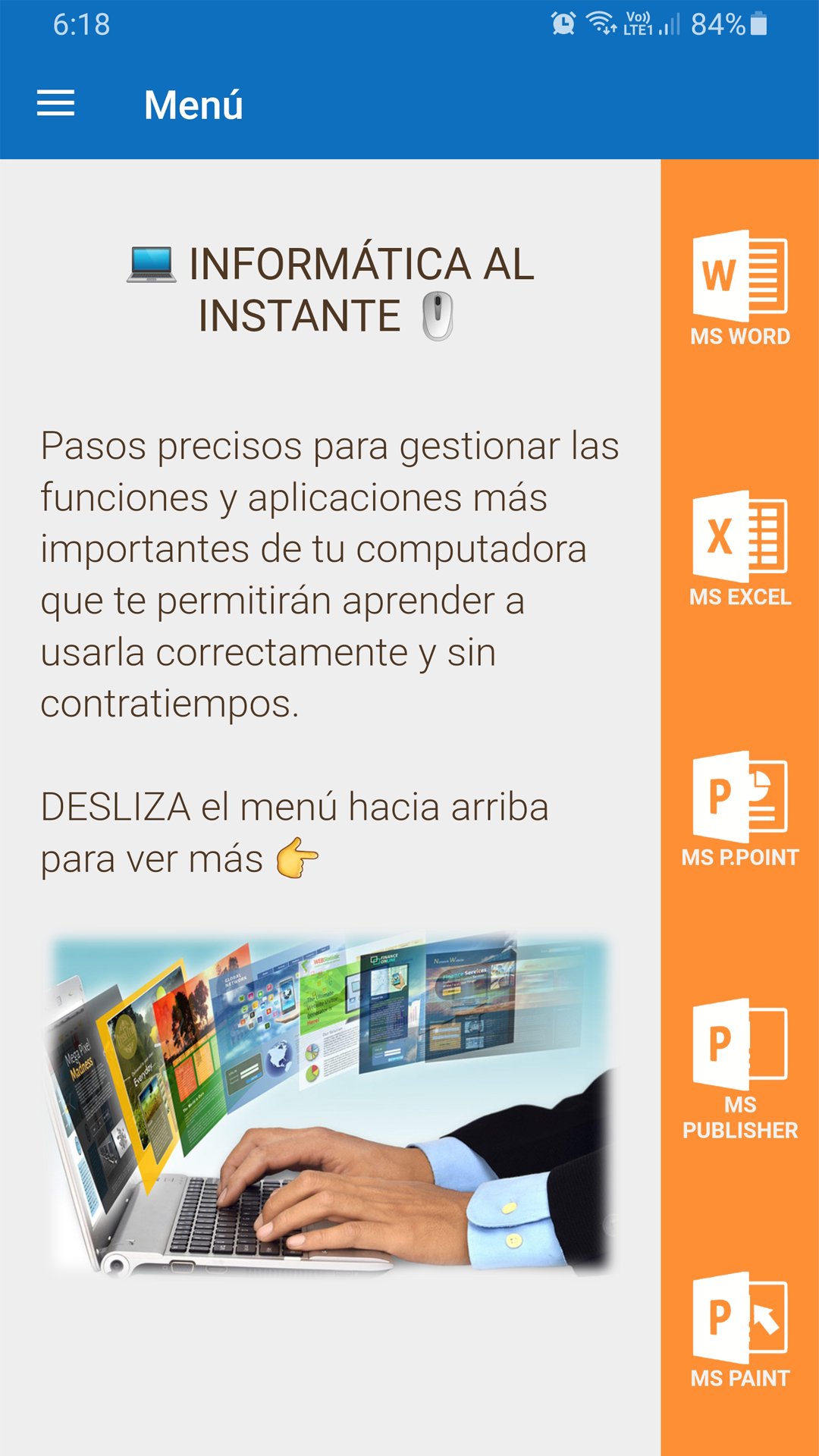 The "Computer Course" app offers you a manual completely in Spanish that teaches you step by step how to work in different tools that you can find on your computer, which have different functions. Nowadays, it is super important to learn basic elements to use the computer, as well as the necessary knowledge to surf the Internet, use email, use social networks, etc.