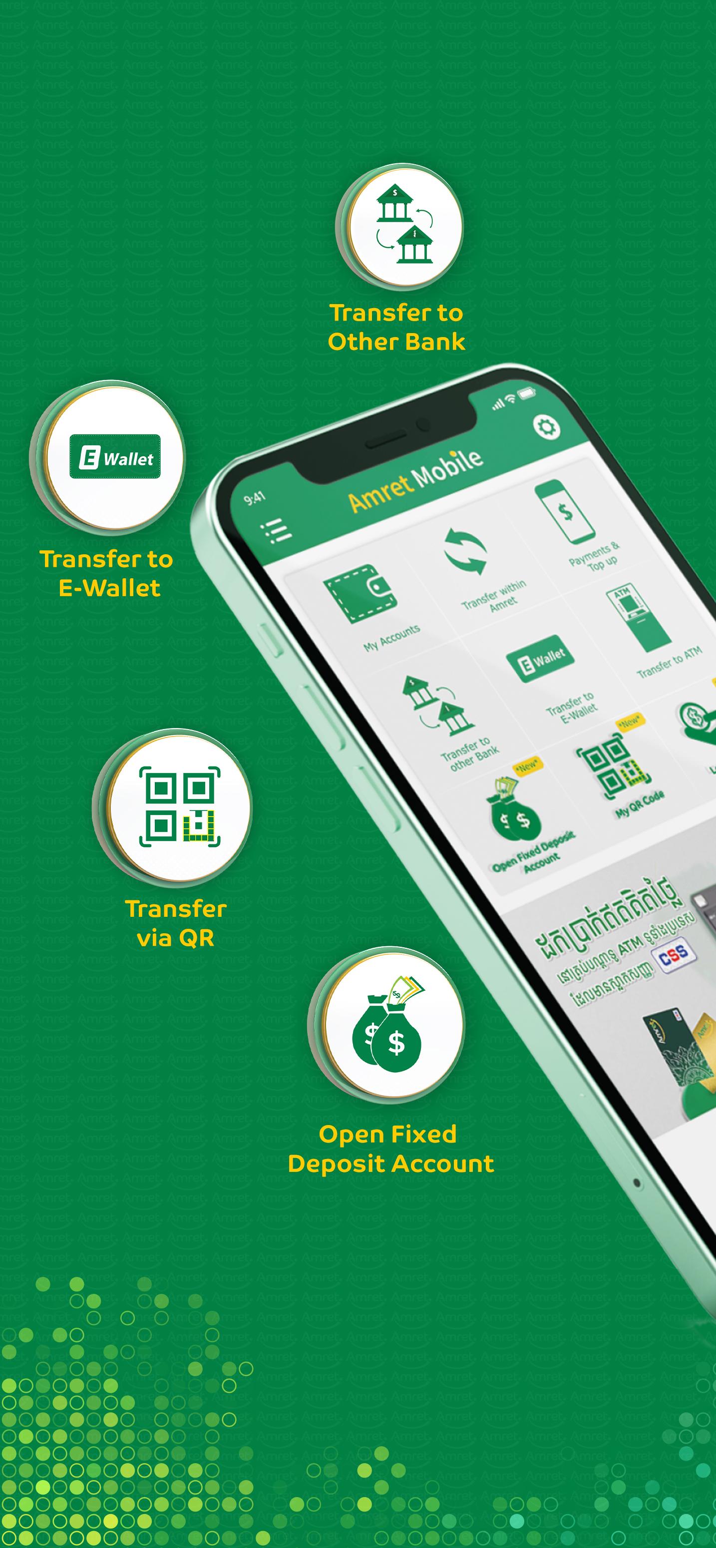 Amret Mobile brings everyday banking services closer to you. Be it a bank transfer, E-wallet top-up, loan repayment, phone top-up, bill payments, or even loan request, you can perform all the services anytime anywhere at the comfort of your smartphone.