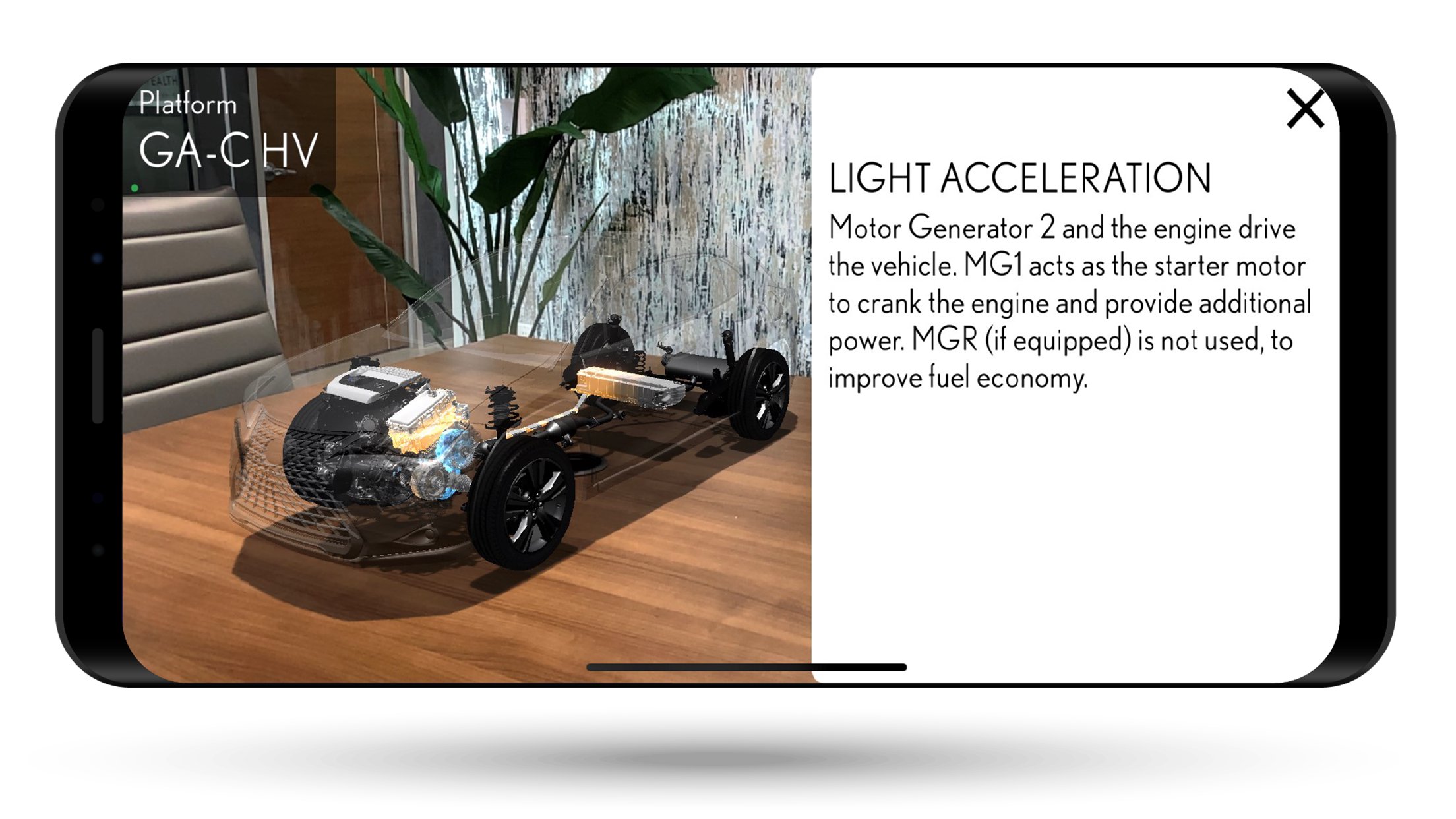 Through immersive and engaging augmented reality (AR), discover self-charging hybrid electric, plug-in hybrid electric, and battery electric vehicle technology. When visiting a Lexus dealer or at home, use the AR functions to experience the Lexus hybrid or BEV technology in action with a virtual model or on an actual vehicle using the Overlay mode.