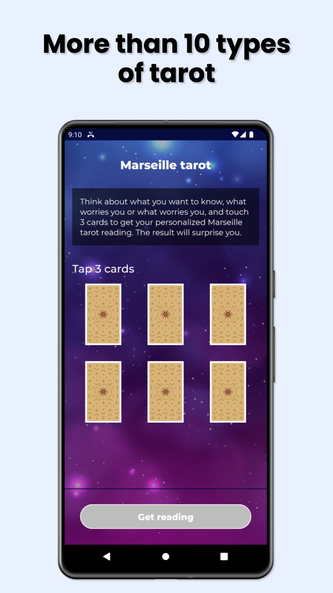 • Marseille Tarot: One of the most popular Tarot readings. Choose 3 cards and find out in general.