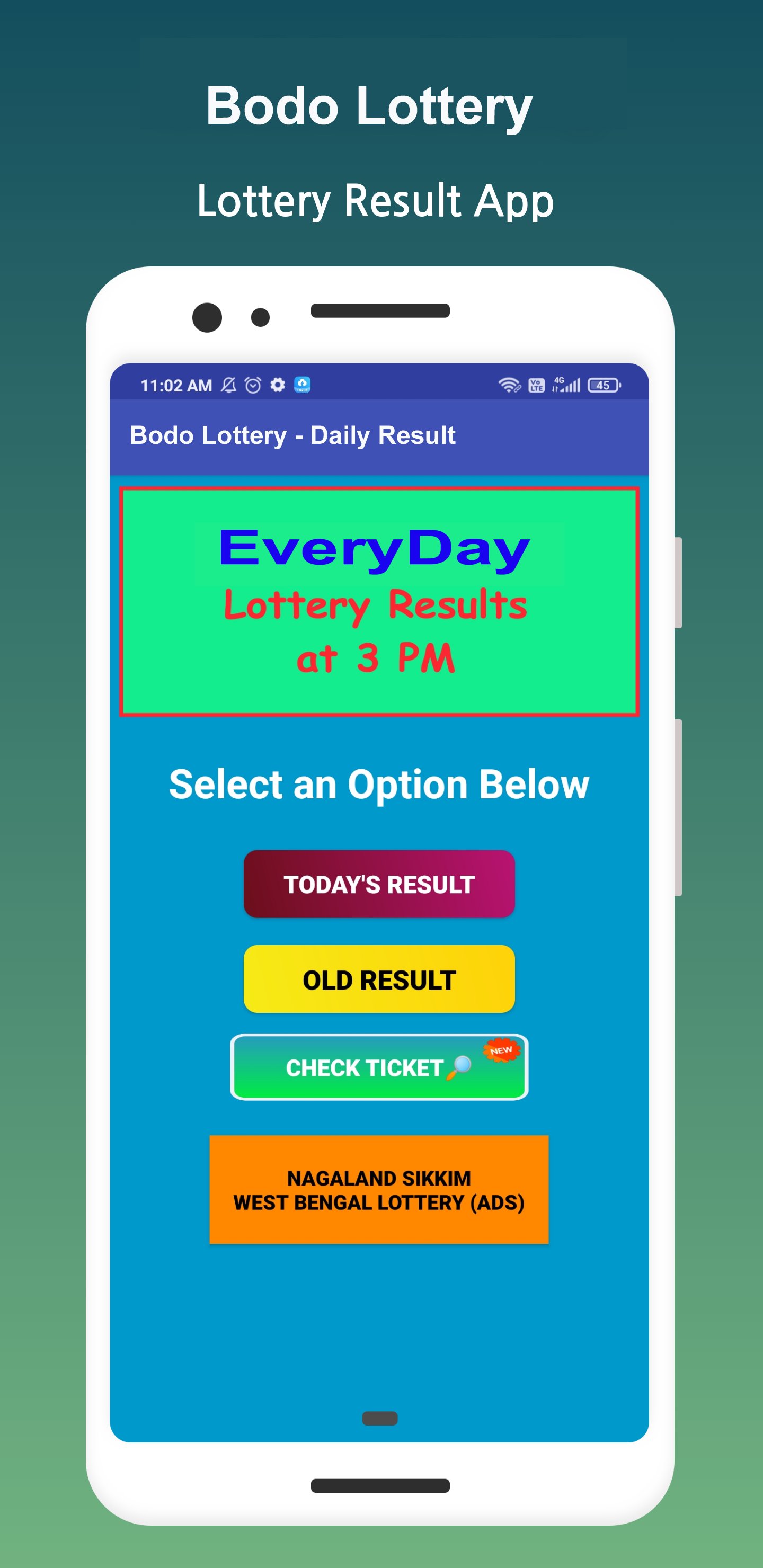 Lottery Result for BodoLand app gives you daily result view of the Bodoland Lotteries . Very fast result view exactly around 3-4 pm daily.