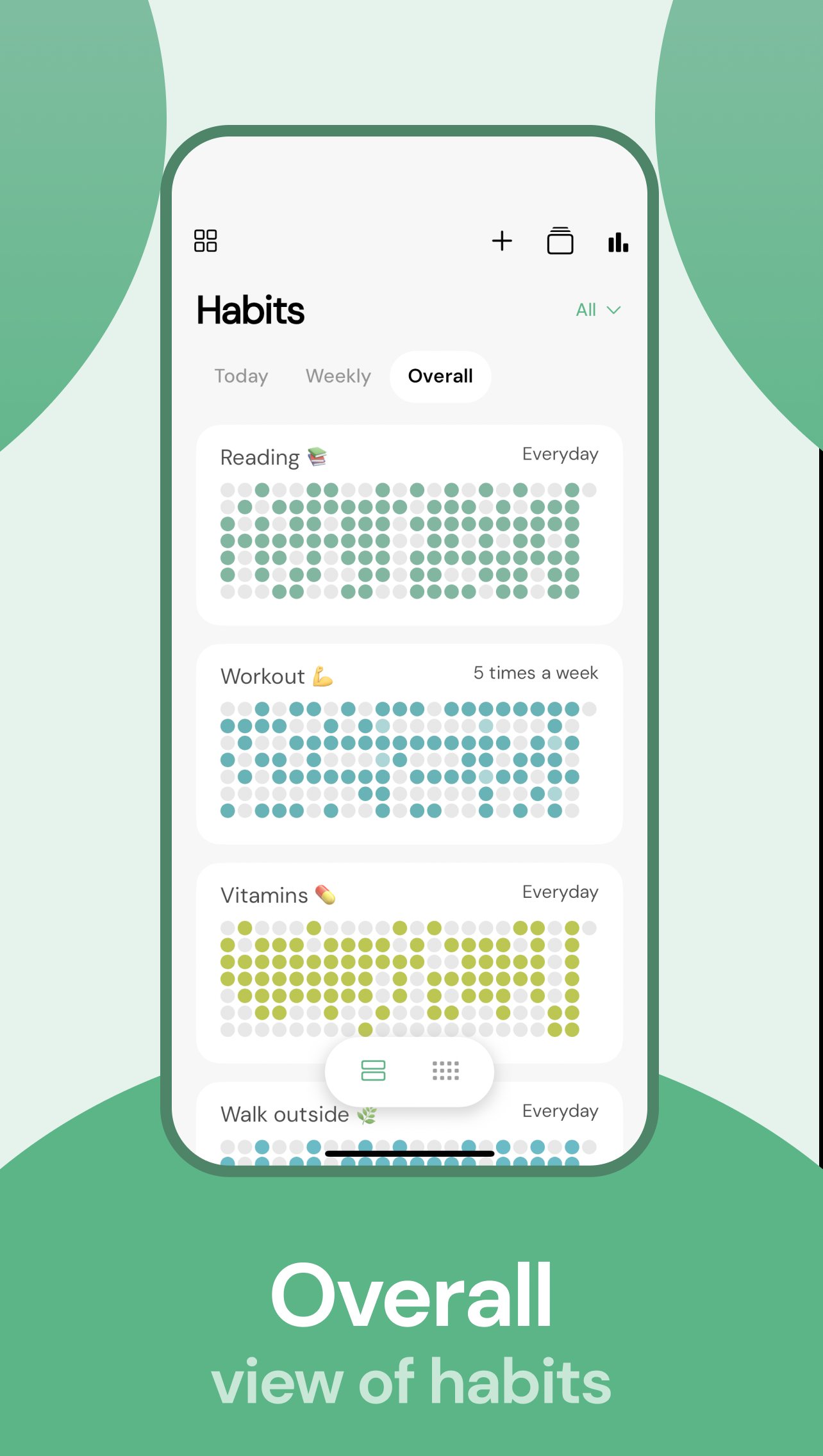 Get a bird's-eye view of all your habits and their weekly progress. Our app helps you visualize your achievements and areas that need improvement, keeping you on track for long-term success.