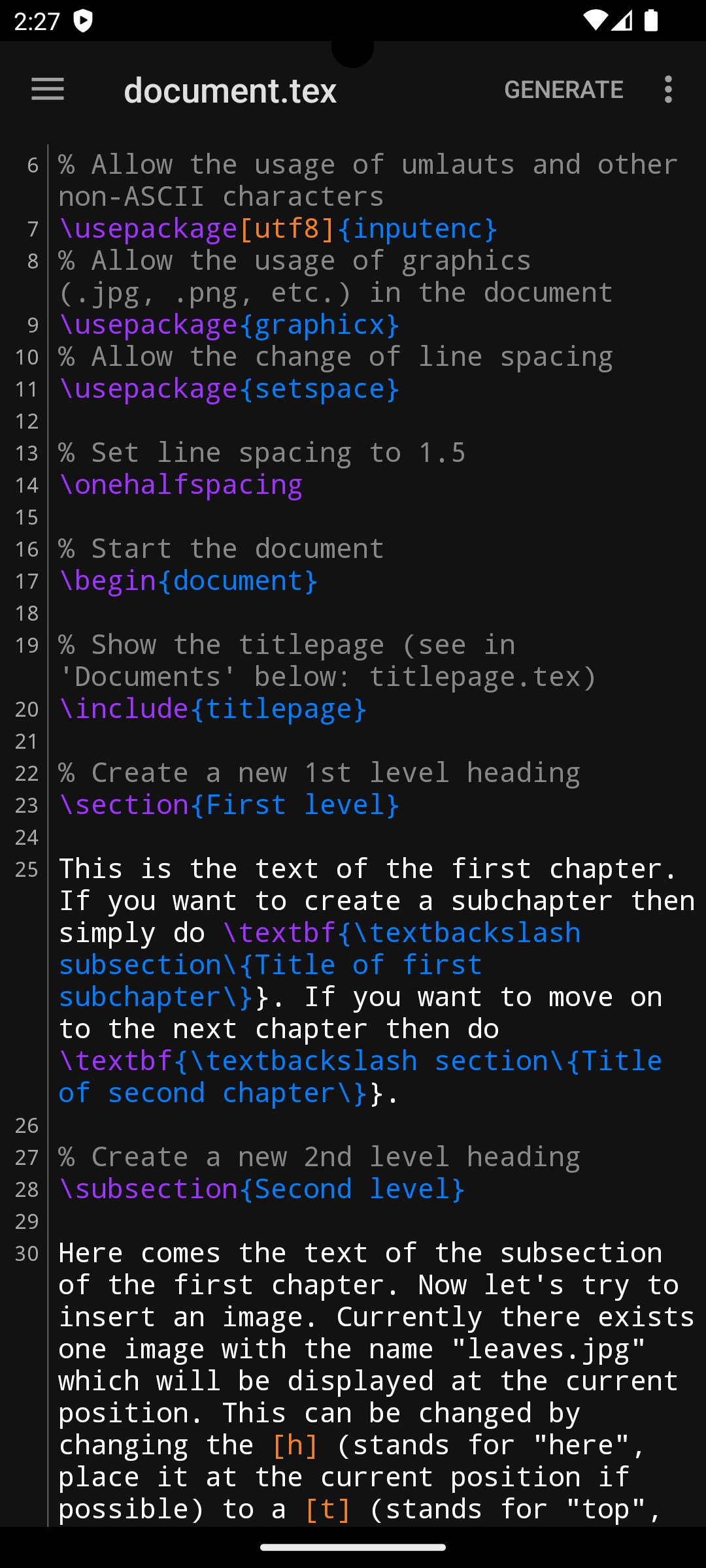 VerbTeX is a free, collaborative LaTeX Editor for your Android device. It allows you to create and manage LaTeX projects directly on your Android device and generate a PDF offline (Verbnox) or online (Verbosus).