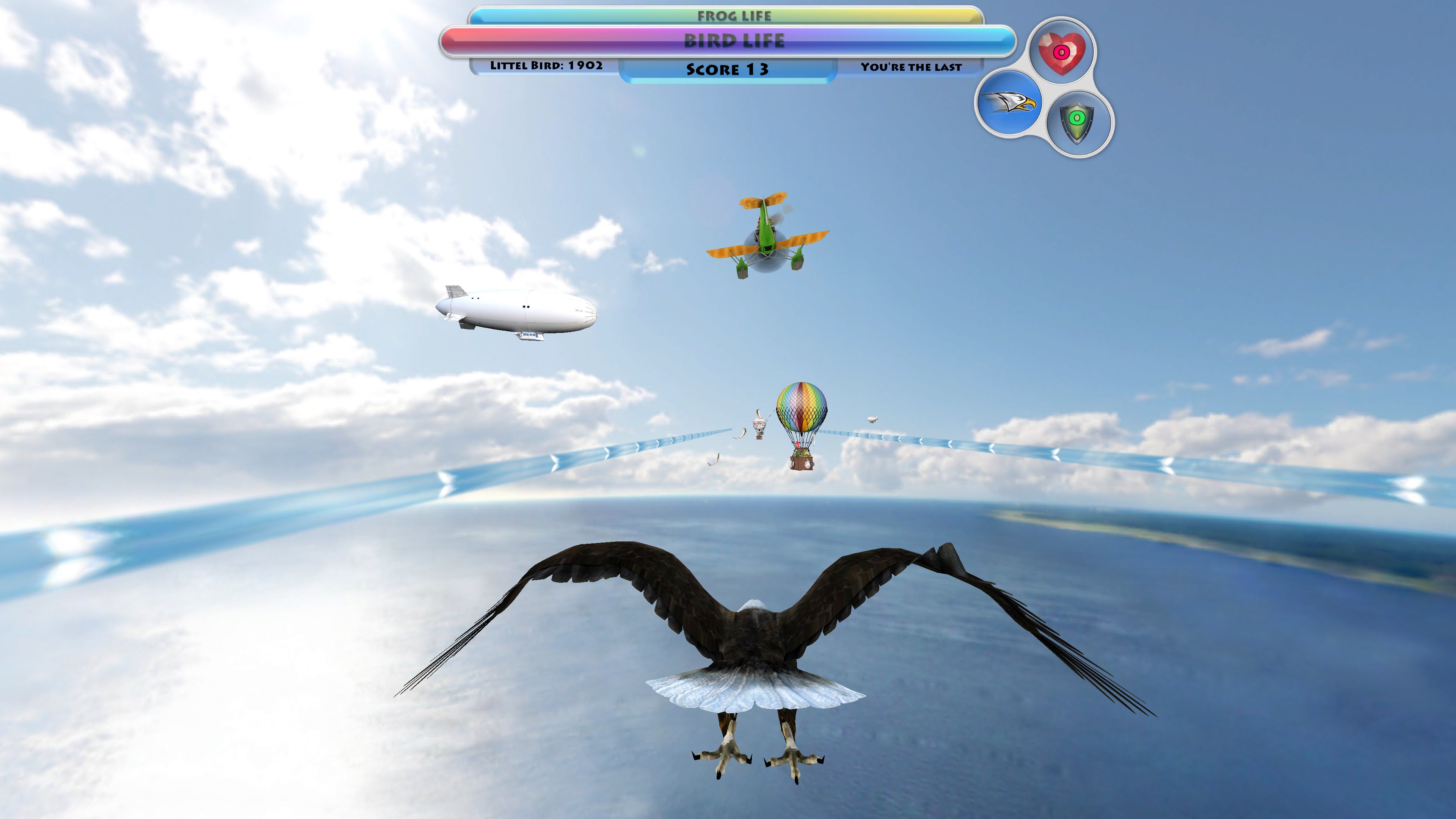 Controle seu voo inclinando o corpo e batendo as asas para pegar o máximo de pontos preciosos que puder. Use aceleração, escudos e outros elementos interativos.