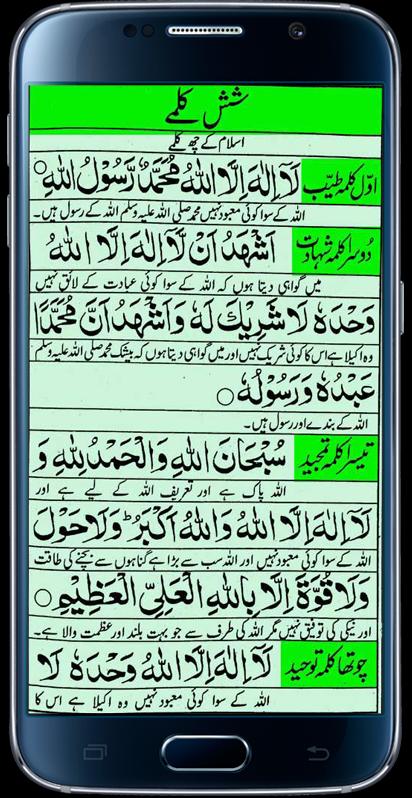 Primeiro Kalma Tayyab, Segundo Kalma Shahadat, Terceiro Kalma Tamjeed, Quarto Kalma Tauheed, Quinta Kalma Astaghfar, Sexta Kalma Radde Kufr.