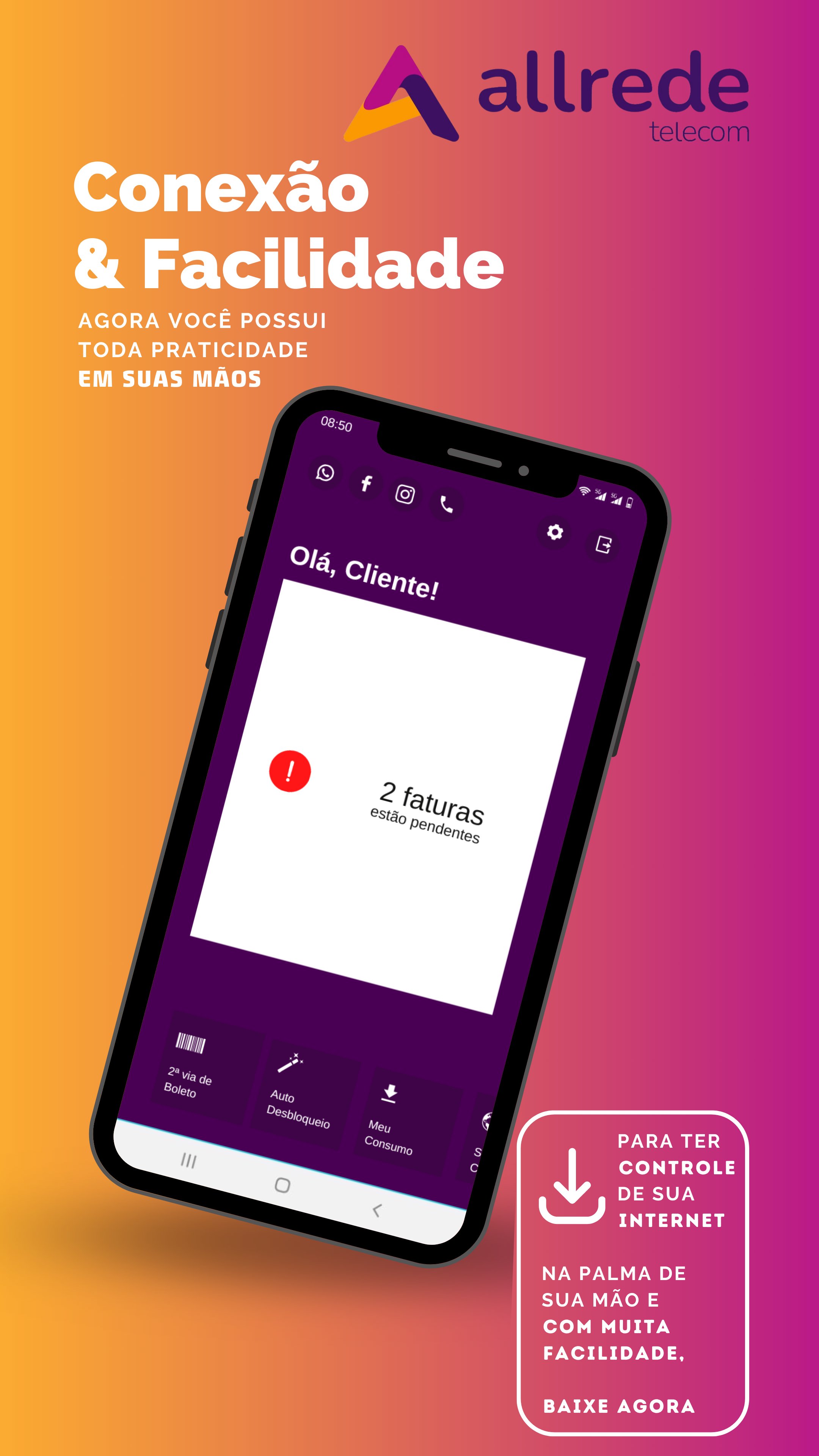 Aplicativo para clientes da Allrede, um jeito mais fácil de gerenciar seu plano de internet.