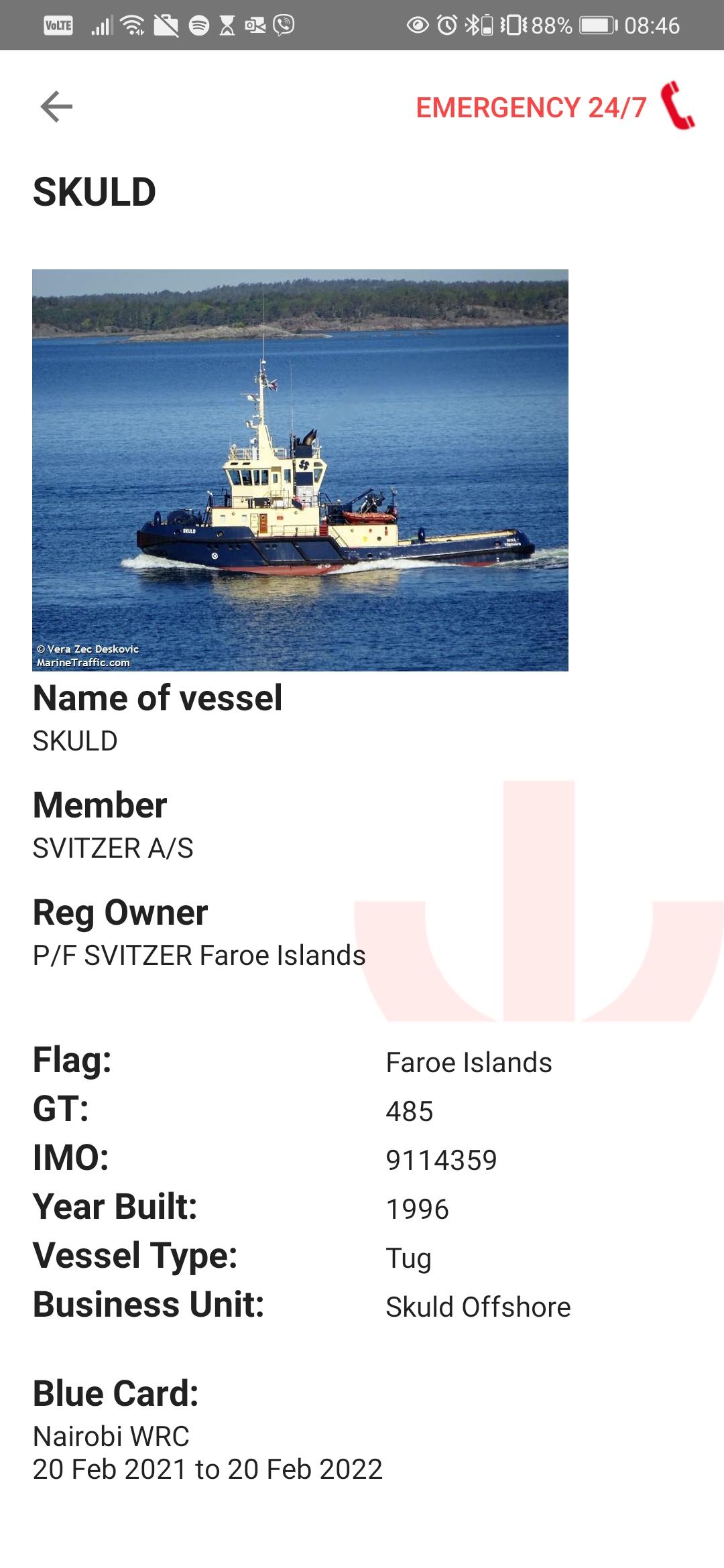 Skuld offers 24/7/365 emergency service to its customers, and in case of emergency, the Skuld app has a shortcut to dial Skuld’s emergency phone number.