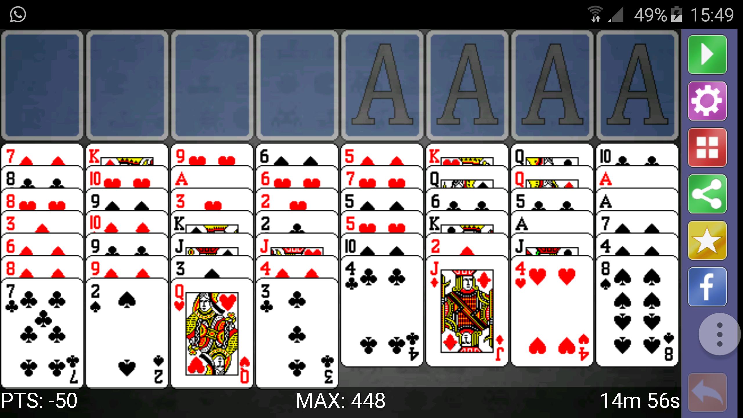 - Quando temos acesso a uma AS, podemos mover a saída de pilhas (parte superior / direita) e vá acrescentando, consecutivamente, todas as cartas do mesmo naipe.