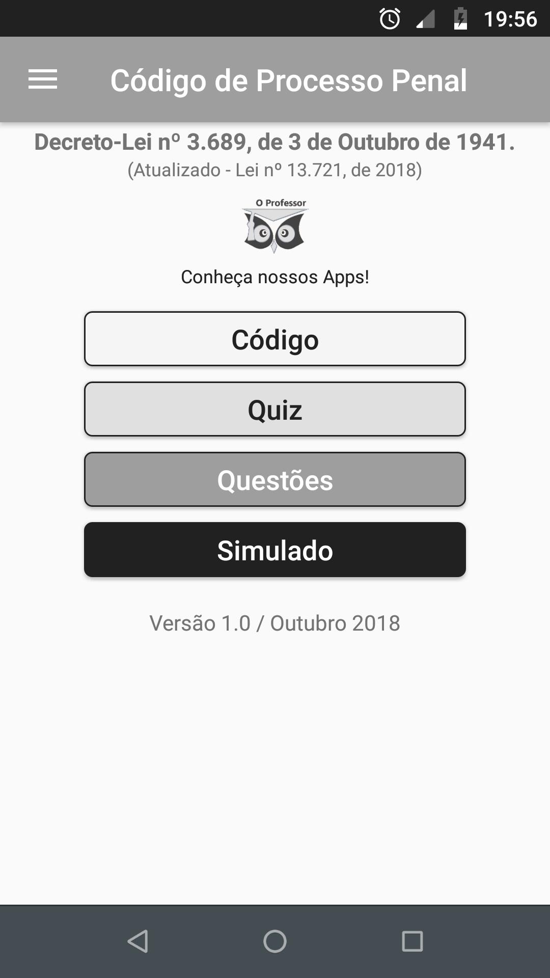 O Professor - Direito Penal é um aplicativo para dispositivos móveis que tem por objetivo disponibilizar o Código Penal, Decreto-Lei nº 2.848, de 07 de Dezembro de 1940, o Código de Processo Penal, Decreto-Lei nº 3.689, de 3 de Outubro de 1941, a Lei de Execução Penal, Lei nº 7.210, de 11 de Julho de 1984, e as demais leis especiais relacionadas ao Direito Penal, para todos os interessados que pretendem realizar concursos públicos ou privados.