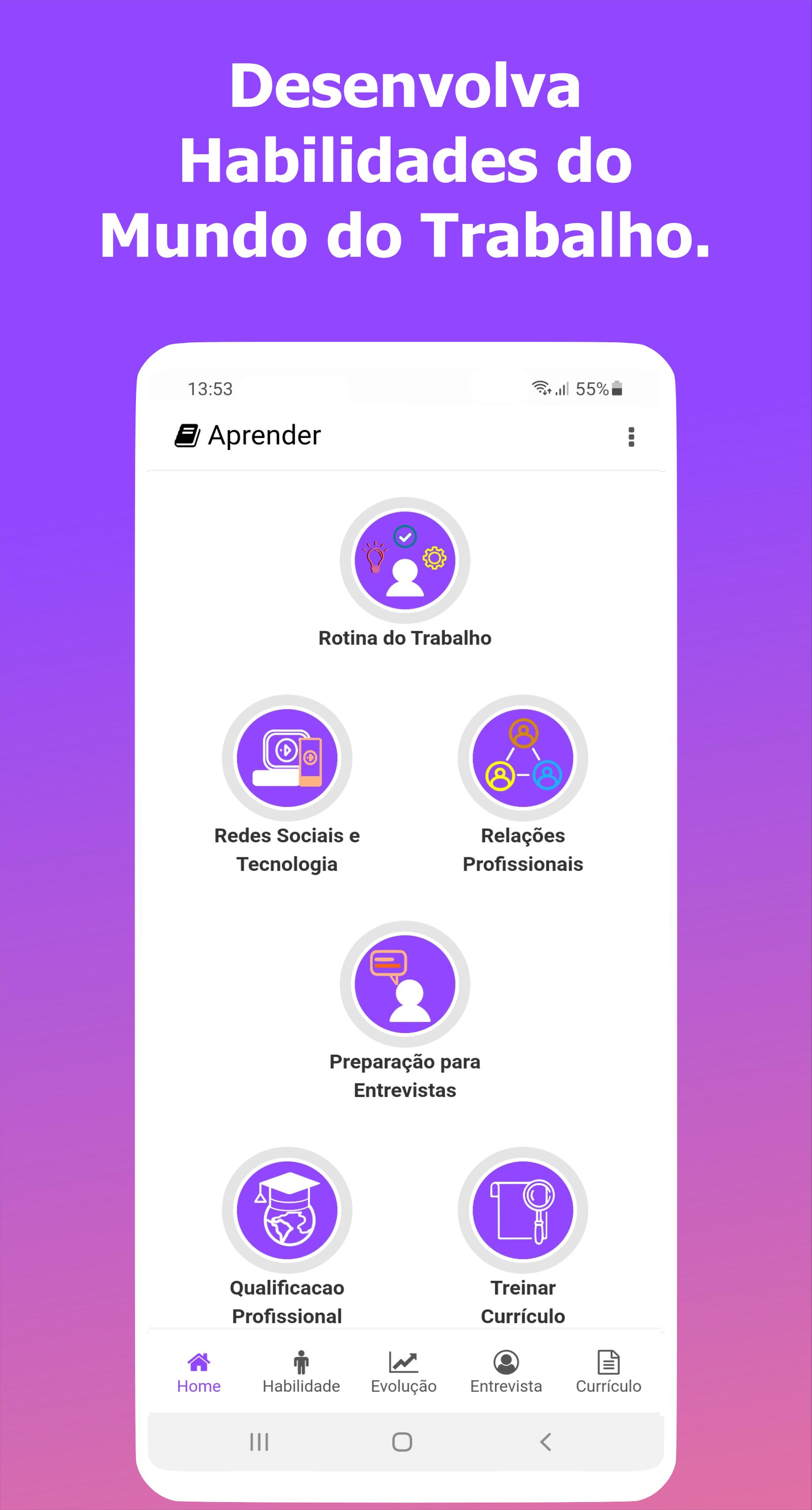 Desenvolvido por especialistas no assunto, e em um formato educativo e dinâmico, o aplicativo tem como objetivo desenvolver os seus conhecimentos para que você compreenda melhor o que as empresas desejam e esperam de você, proporcionando assim, uma maior aproximação e um melhor conhecimento em relação ao mundo profissional e o seu desenvolvimento pessoal.