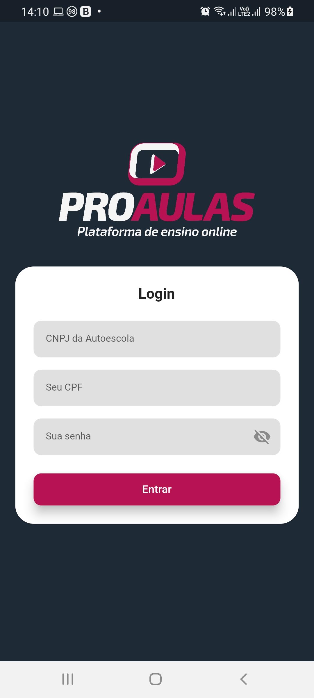 Quando a autoescola te cadastrar na plataforma ProAulas, você receberá, por e-mail, os dados de acesso ao aplicativo ProAulas.