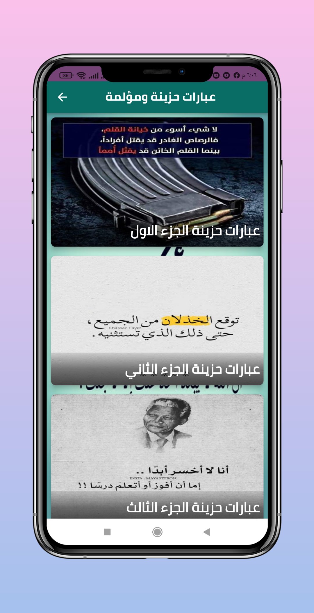 تطبيق منشورات و عبارات حزينة للفيس و حالات واتس اب هو برنامج يجمع عديد العبارات و الكتابات الحزينة من بين اقسامه :