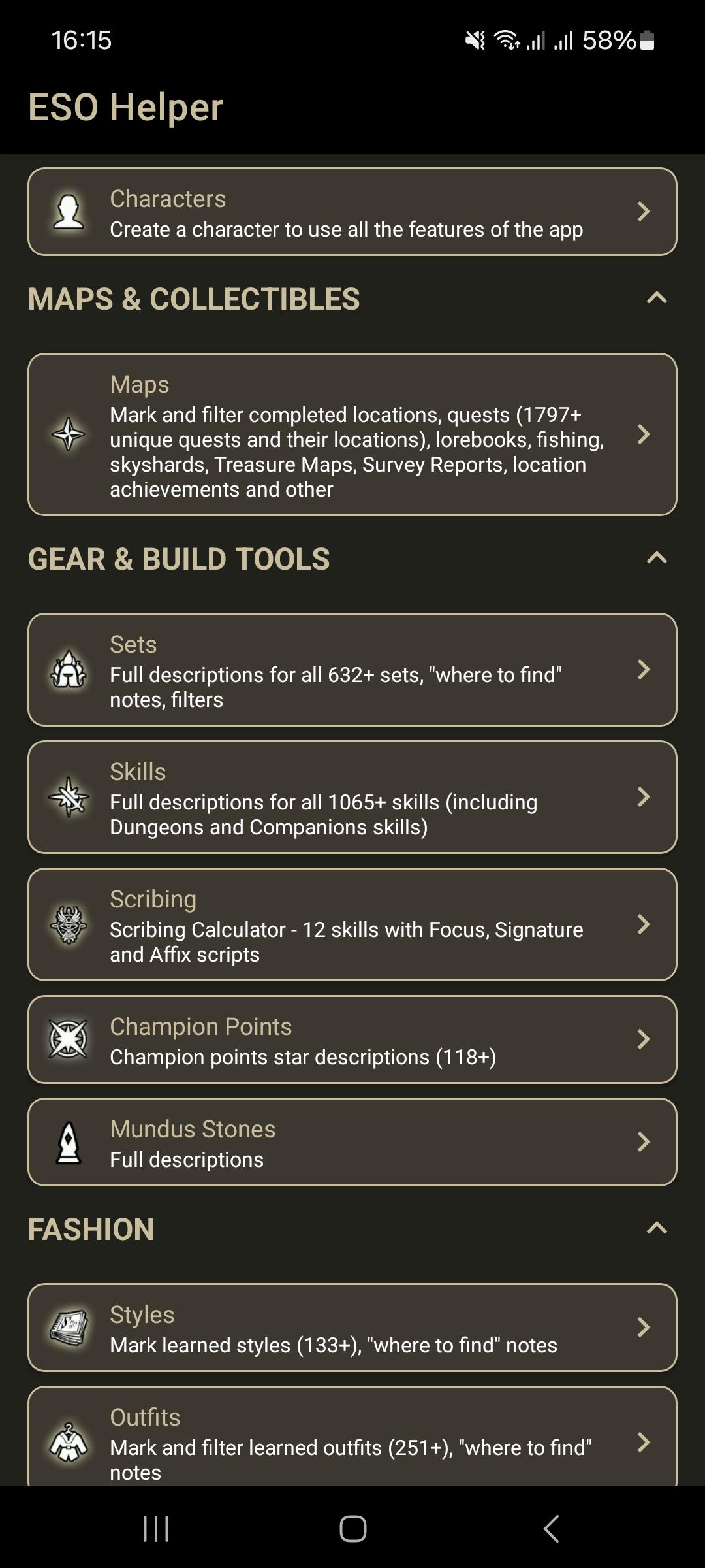 "ESO Helper" e o desenvolvedor deste aplicativo não são afiliados à ZeniMax Online Studios, à Bethesda Softworks ou a outras empresas relacionadas a "The Elder Scrolls: Online".