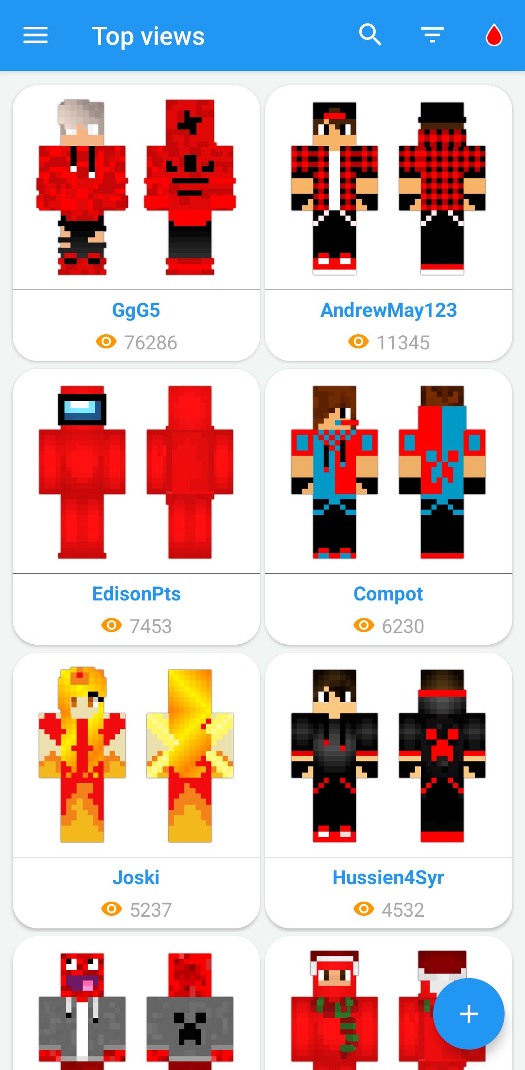 Todos os mc pe heroes são convenientemente classificados em diferentes categorias. Você pode encontrar as novas peles mais populares do Minecraft nas abas "weekly top" ou "top views", adicioná-las aos favoritos, e também visualizar seu personagem favorito em 3D.