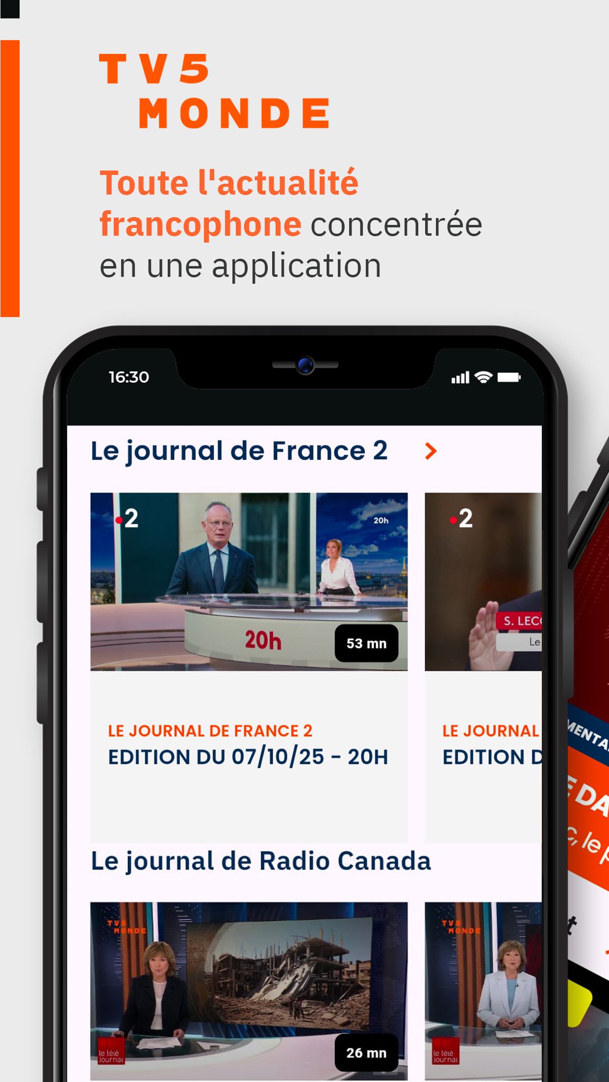 - Programas de notícias de todos os nossos parceiros francófonos, em reprise e na íntegra: encontre rapidamente os programas de notícias mais assistidos dos principais canais francófonos, disponíveis em reprise diretamente no aplicativo. Para uma viagem ao redor do mundo com perspectivas francófonas sobre eventos atuais!