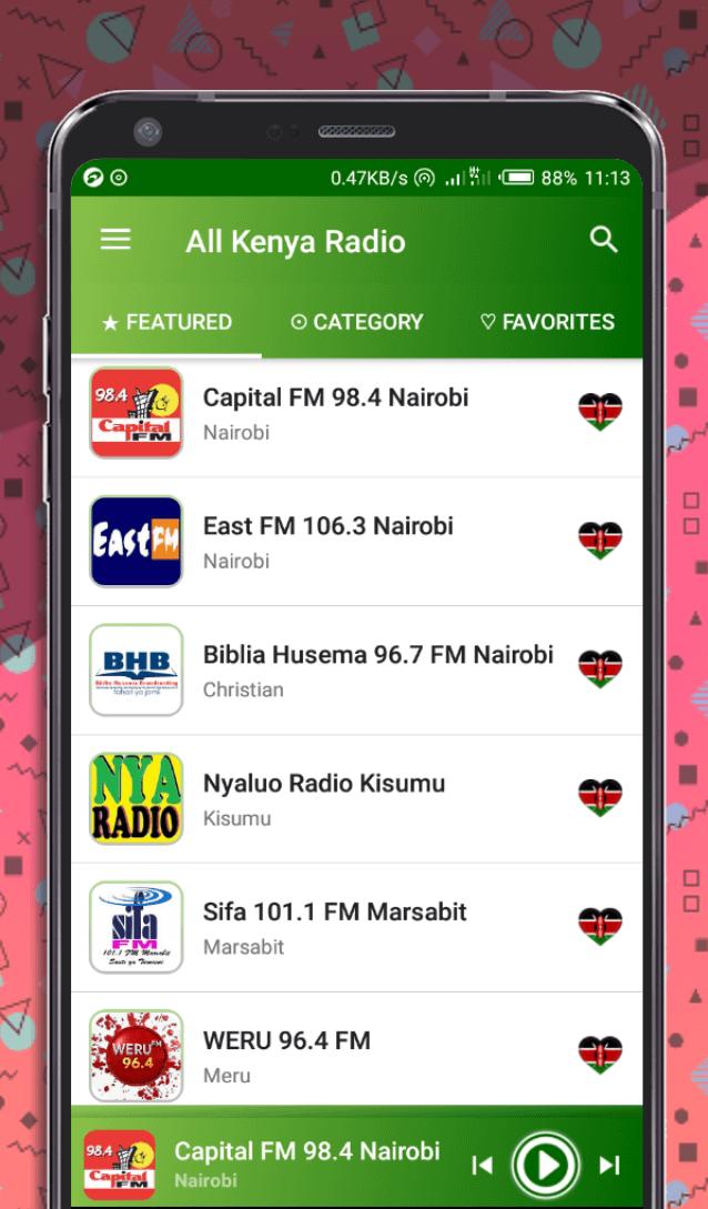 Mais de 400 estações de rádio de todos os condados do Quênia e também estações de rádio quenianas nos EUA, Canadá, França, Reino Unido, Jamaica e locais interessantes em todo o mundo.