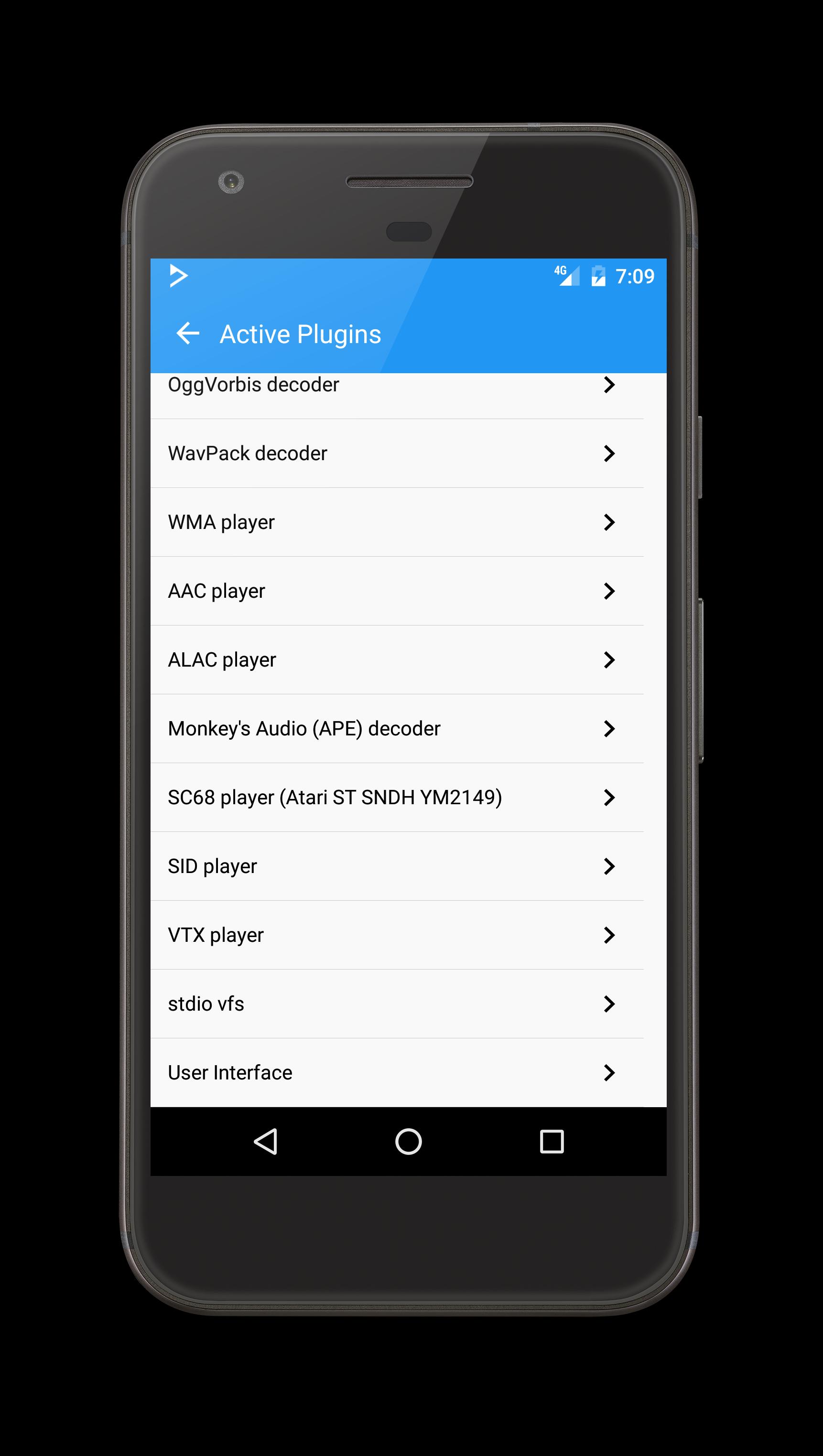 Os decodificadores incluíram: AAC, ALAC, APE, SNDH, SID, VTX, AY, GBS, GYM, HES, KSS, NSF, NSFE, SAP, SFM, SPC, VGM, VGZ.