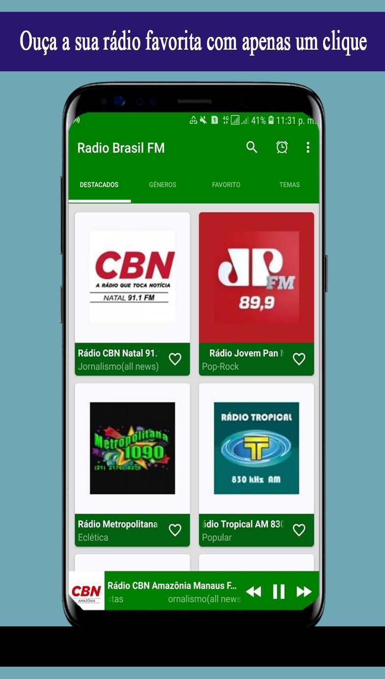 Se você é um amante da rádio brasil am fm ao vivo, este aplicativo é perfeito para você. Ele é feito para que você possa desfrutar de muitas estações de rádio brasileiras seu melhor aplicativo, esportes, música, entretenimento ao vivo com estações de rádio brasileiras Player dos diferentes intérpretes de rádio que transmitem ao vivo.