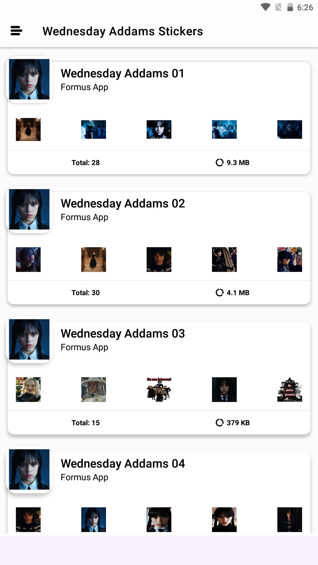 Este é um aplicativo Android divertido que fornece adesivos animados de quarta-feira Addams prontos para usar em suas conversas. Este aplicativo contém uma variedade de adesivos de quarta-feira Addams com suas expressões e poses icônicas. Esses adesivos certamente adicionarão uma dose de humor negro às suas conversas e as tornarão mais divertidas. Todos os adesivos são fáceis de usar e você pode arrastá-los e soltá-los em suas conversas do Whatspp. Eles certamente tornarão seus bate-papos mais animados e emocionantes.