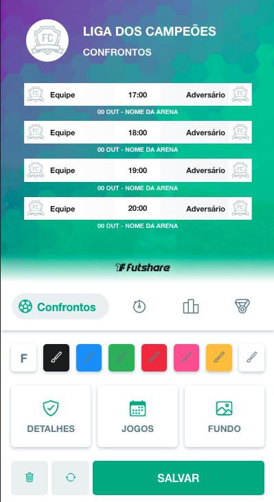 Adicione os escudos da sua equipe e do seu adversário, informe o local e data do confronto e publique direto no perfil da sua Arena.