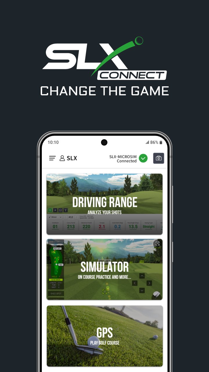 Medição de distância orientada por GPS. O SLX Connect incluirá funcionalidade de simulador de golfe para uso com todo o hardware de simulador de golfe Swing Logic. Ele fornece estatísticas detalhadas de métricas de swing, distância, velocidade da cabeça do taco, velocidade da bola, direção de lançamento (ao usar o SLX NanoSensor) e visualizações 3D de tacadas durante as sessões de treino.