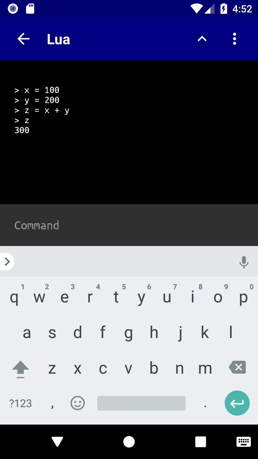 Explore, escreva e execute o código Lua em tempo real com o melhor interpretador Lua do Google Play para Android. Aprenda a programar ou executar cálculos simples usando a sintaxe simples de Lua.
