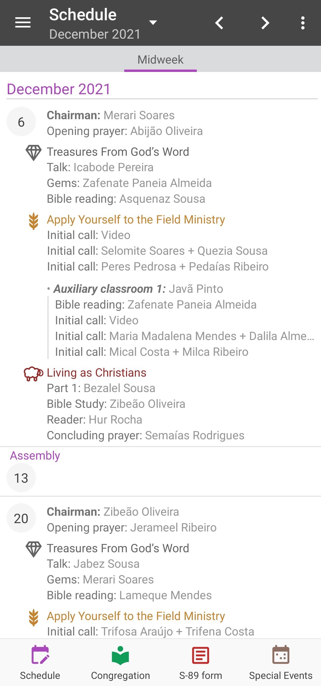 Aplicativo para elaborar a escala das reuniões das Testemunhas de Jeová (JW):