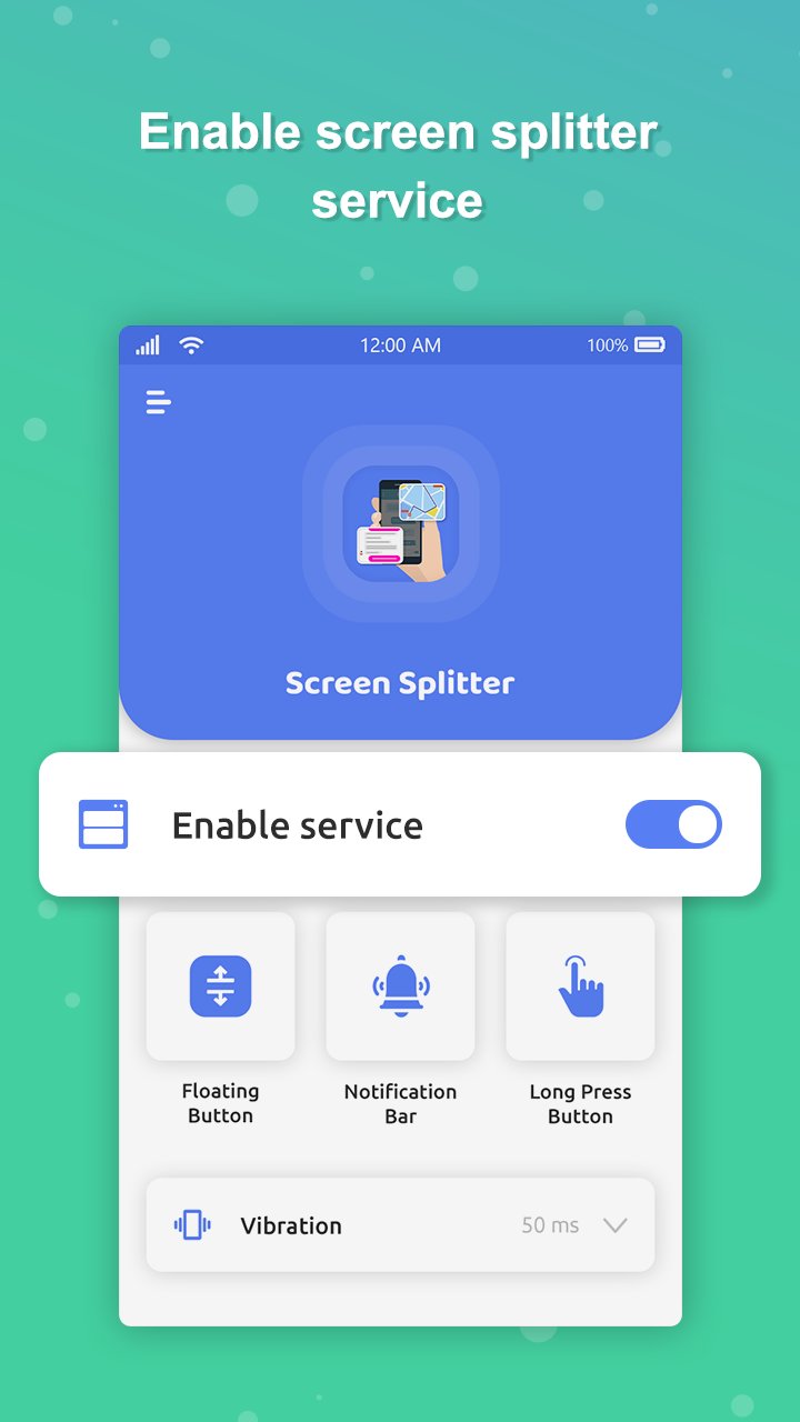 Em primeiro lugar, ative o serviço de divisão de tela para permitir o uso do recurso do aplicativo. Você receberá um atalho flutuante de tela dividida na tela. Toque no atalho para usar o aplicativo em tela dupla. Você pode alterar a cor do botão flutuante, tamanho e opacidade. Ative e desative a notificação do aplicativo Screen Splitter. Ative facilmente 2 aplicativos em uma tela pressionando longamente os botões de acessibilidade, voltar e início. Altere a configuração de vibração ou desative pressionando longamente o atalho de tela dividida.