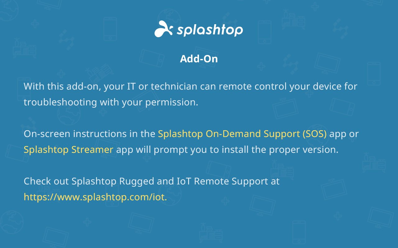 Este complemento permite o controle remoto de um dispositivo Samsung através do aplicativo Splashtop SOS ou do aplicativo Splashtop Streamer por um técnico usando o Splashtop Rugged & IoT Remote Support com licença comercial adequada necessária .