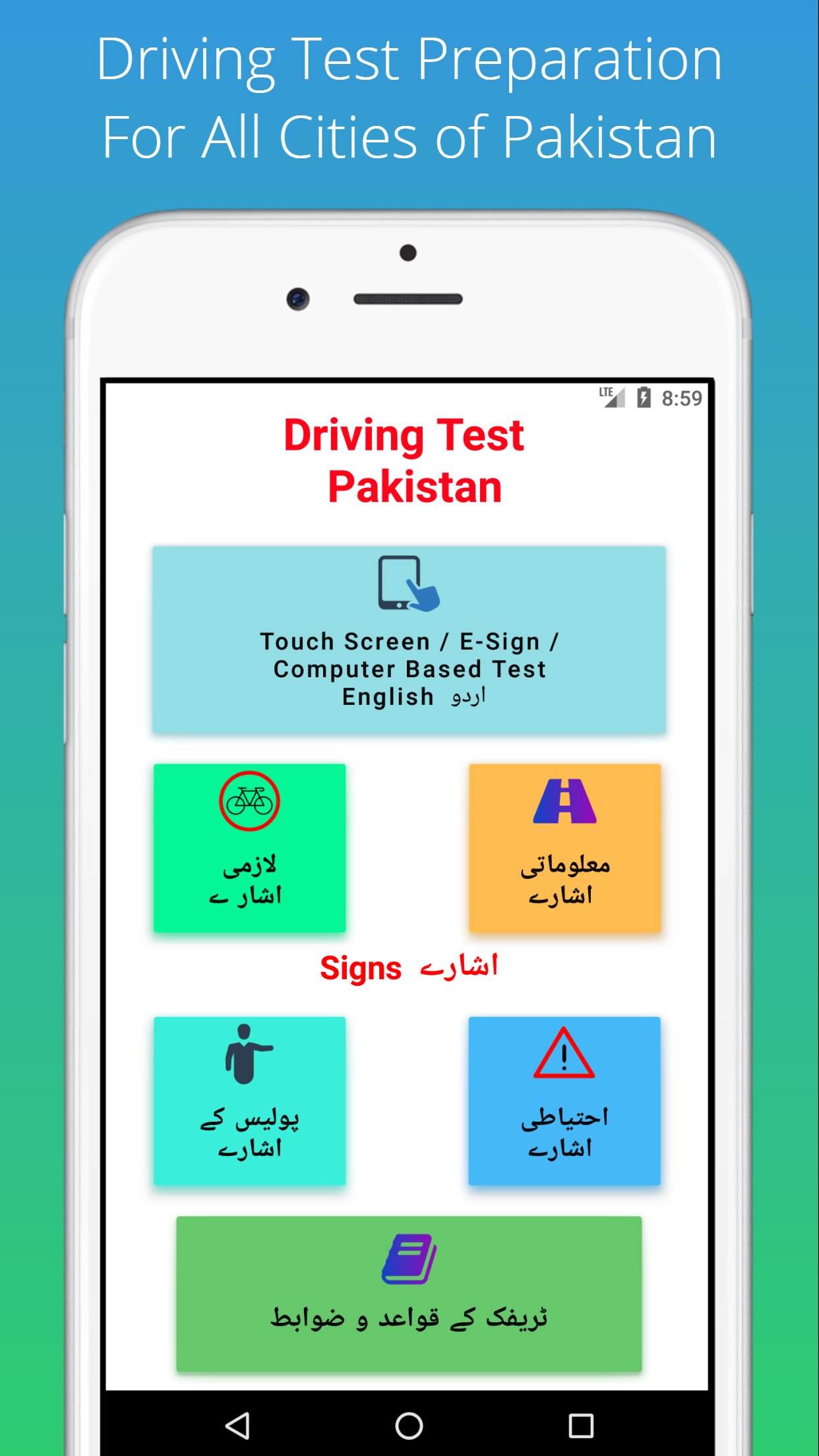 ٹریفک پولیس پاکستان نے ڈرائیونگ لائسنس کے لئے لاہور ، کراچی ، اسلام آباد ، گوجرانوالہ ، فیصل آباد ، سرگودھا ، ملتان ، راولپنڈی ، پشاور ، حیدرآباد ، کوئٹہ ، کشمیر، گلگت ، بہاولپور ، سیالکوٹ ، ساہیوال ، لاڑکانہ ، شیخوپورہ ، ایبٹ آباد ، جھنگ ، وغیرہ جیسے مختلف شہروں میں ای سائن یا ٹچ اسکرین ڈرائیونگ ٹیسٹ متعارف کردیا۔ ای سائن ٹیسٹ انگلش اور اردو میں حل شدہ ایم سی کیو اس ایپ میں شامل ہیں۔ آپ کمپیوٹرائزڈ ٹیسٹ پاس کرکے اپنا ڈرائیونگ لائسنس حاصل کرسکتے ہیں جسے ای سائن ڈرائیونگ لائسنس ٹیسٹ کہا جاتا ہے۔ اس ایپ میں سڑک کے تمام نشانات ٹریفک قوانین اور ڈرائیونگ لائسنس سوالات شامل ہیں۔ برائےکرم یہ سارے قواعد و ضوابط پڑھیں روڈ سائن کے تمام معنی کو سمجھیں اور گرین اینڈ سیف پاکستان بنانے میں ہماری مدد کریں۔ ڈرائیونگ لائسنس اتھارٹیز پاکستان۔ ڈرائیونگ لائسنس جاری مینجمنٹ سسٹم (ڈی ایل آئی ایم ایس) حکومت پنجاب ، ڈرائیونگ لائسنس سندھ (ڈی ایل ایس) حکومت سندھ ، کوئٹہ ٹریفک پولیس (کیو ٹی پی) حکومت بلوچستان ، ٹرانسپورٹ خیبر پختونخوا (ٹی کے پی) حکومت خیبر پختونخوا۔ گلگت بلتستان پولیس (جی بی پی) ، جی او پی ، ٹریفک پولیس آزاد جموں و کشمیر (ٹی پی اے جے کے ، ڈی ایل آئی ایم ایس) حکومت پاکستان۔