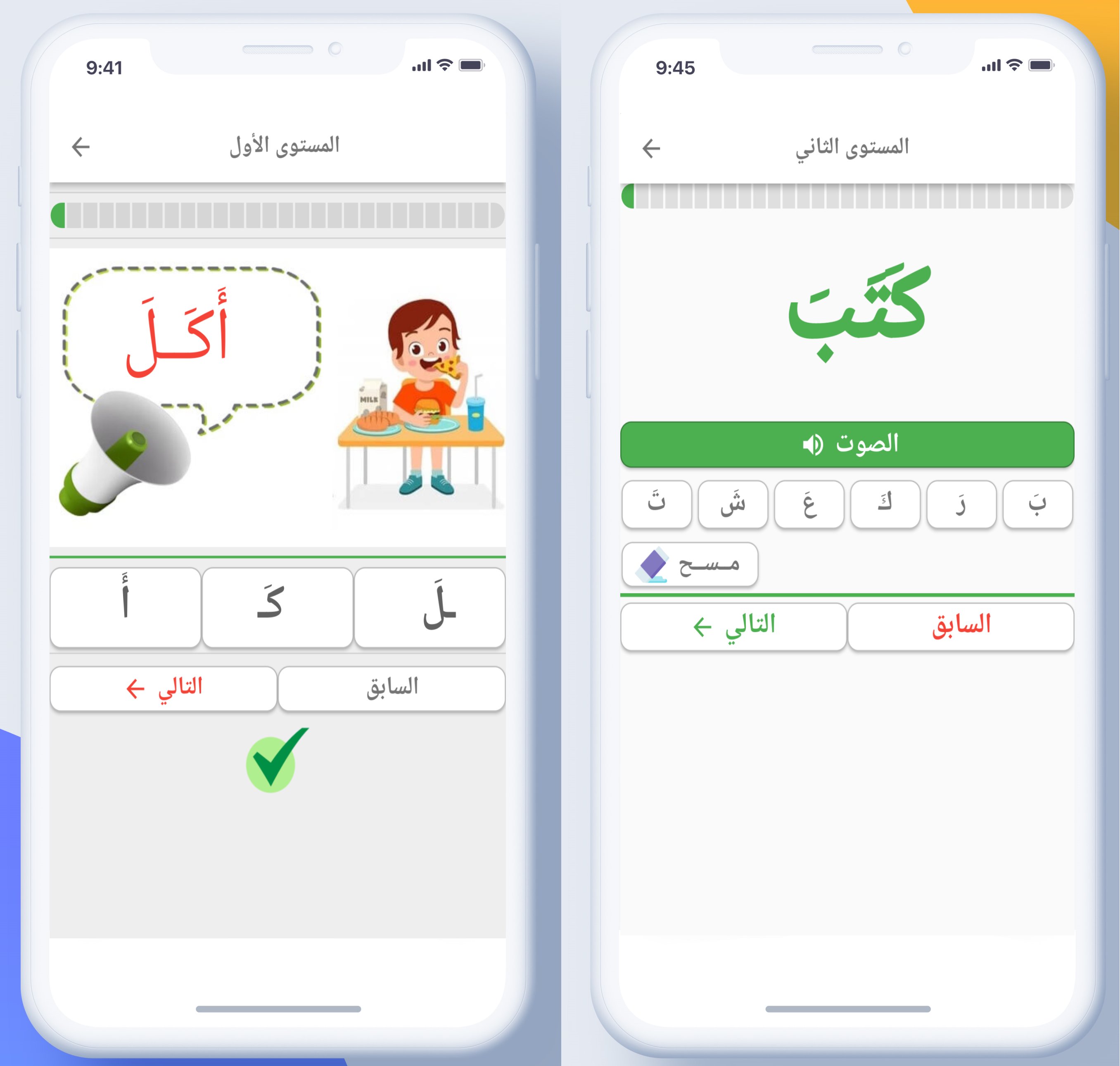 -الإملاء، وفيه يستطيع الطفل تكوين الكلمات التي يتم إملاءها عليه بالصوت من خلال لمس الحروف الموجودة على الشاشة وإعادة ترتيبها.