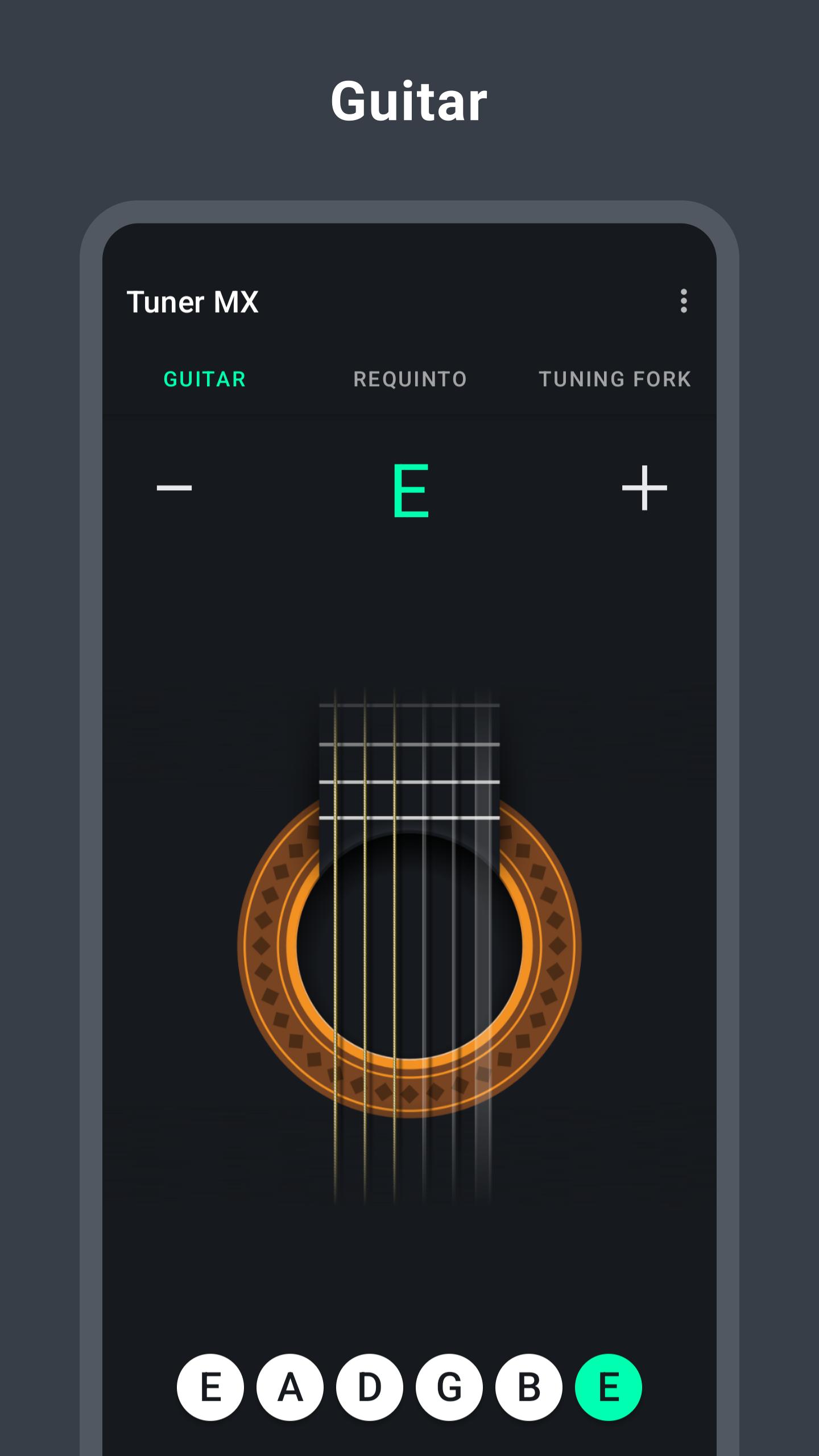 Tuner MX is a tuner designed for Requintos and Guitars (guitar requinto is similar to a guitar but smaller and with a higher pitch: A2-D3-G3-C4-E4-A4).