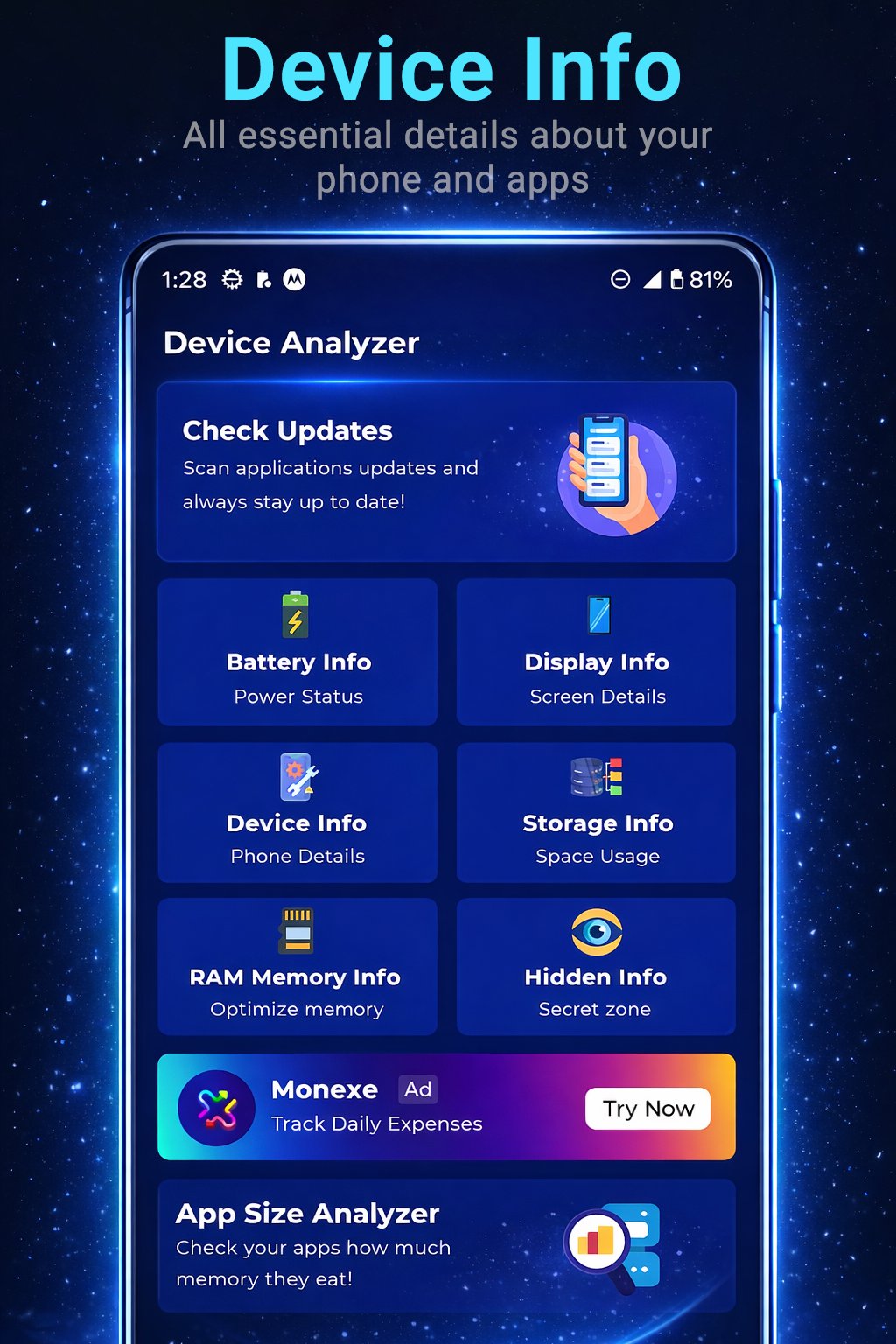 🔍 Apps Analyzer & Updates: Scan installed apps, analyze their permissions, and quickly check for available updates to keep your phone secure.