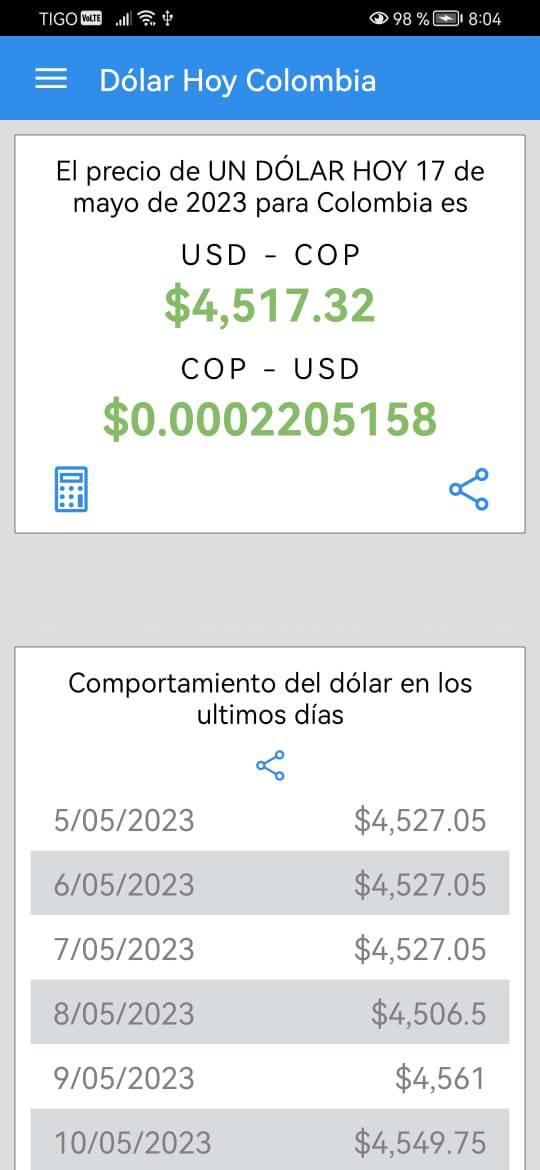 Dollar Today Colombia allows you to share screenshots of the values ​​calculated in the currency calculator. Whether you want to share the results of a specific conversion or show the historical trend of the dollar, you can easily do it through messages, social networks or any other platform of your choice.
