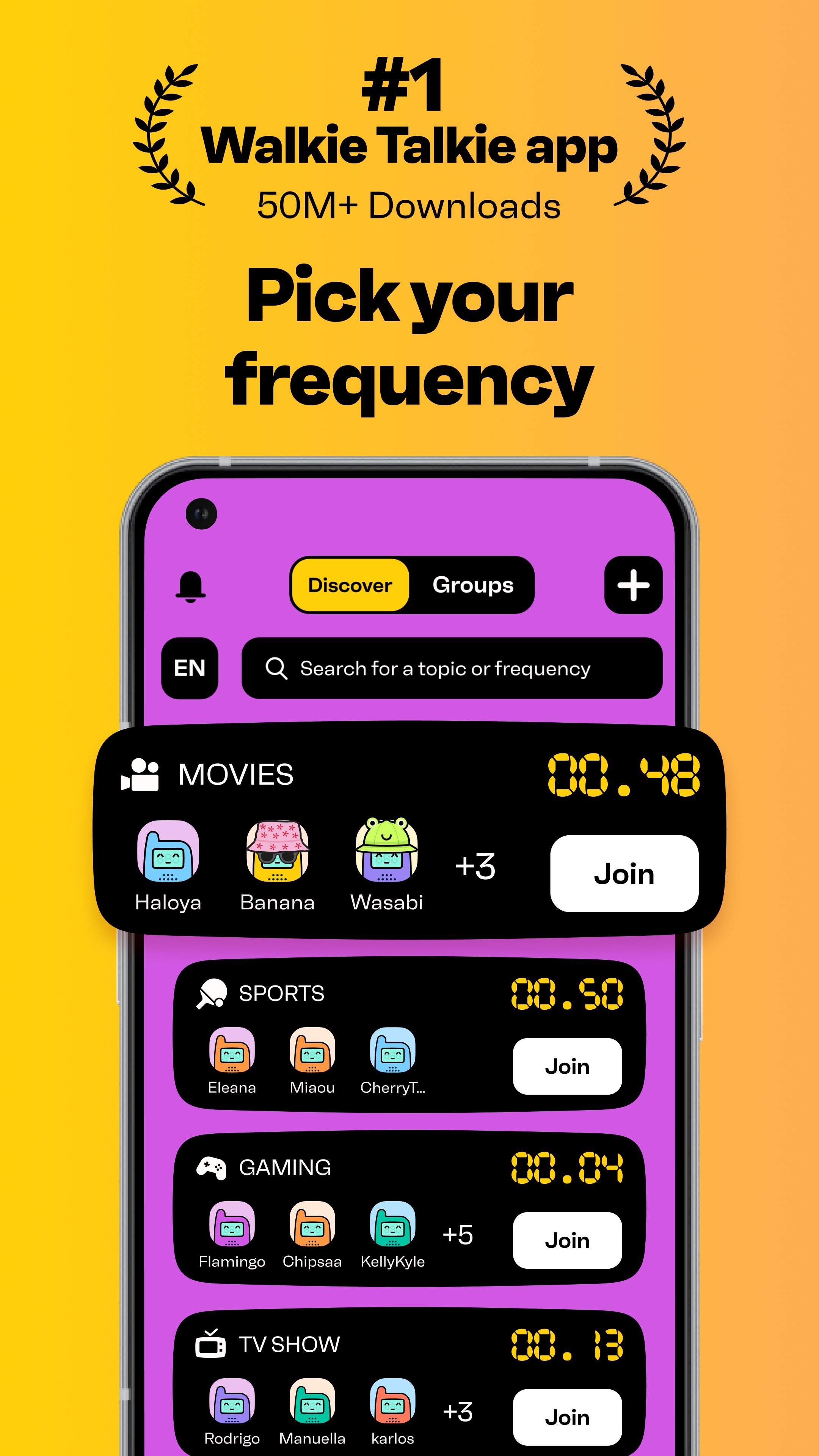 On Walkie Talkie you can browse through topics and choose the conversation you'd like to join!
