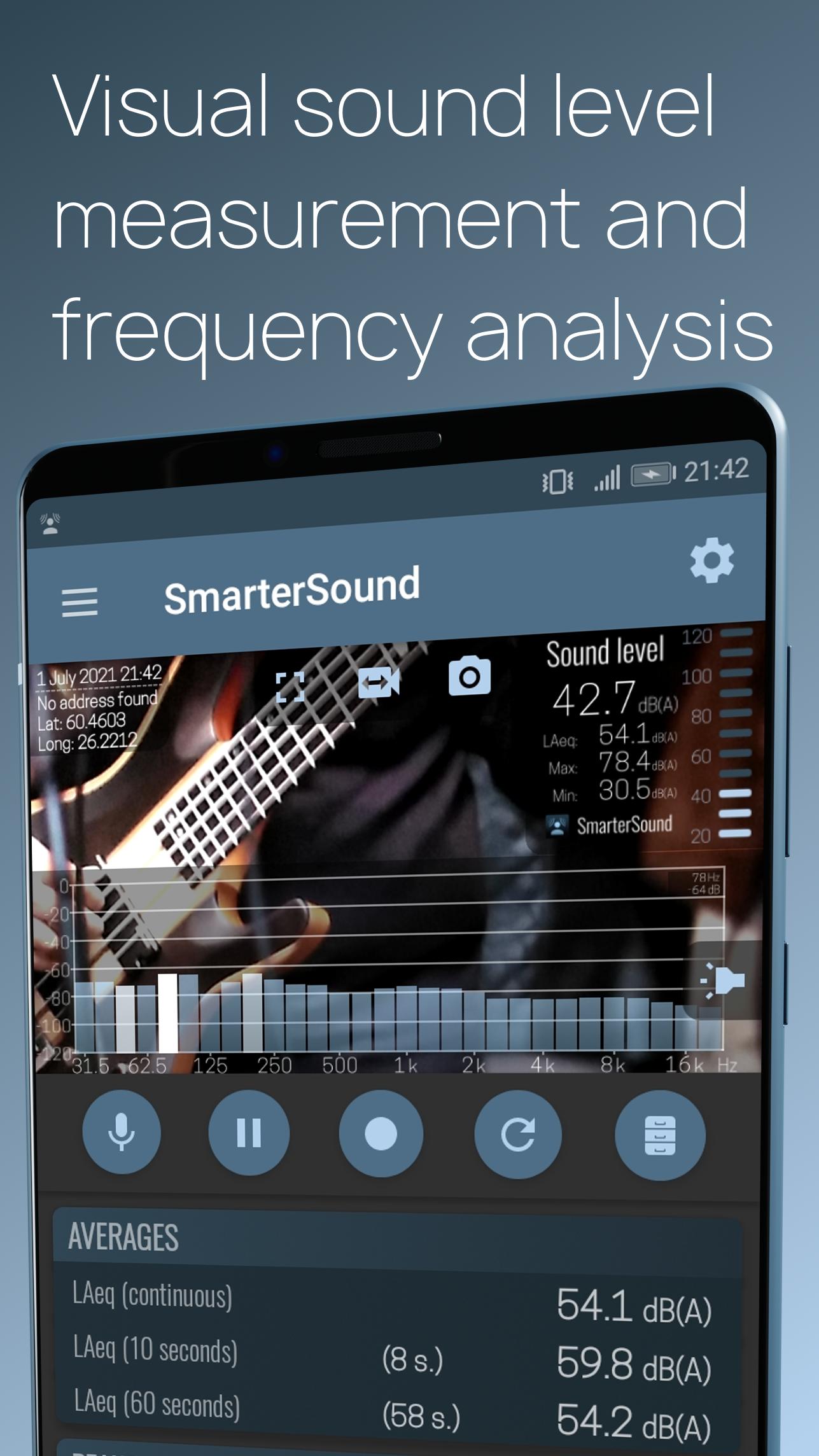 SmarterSound is the ad-supported version of the SmarterNoise Pro recording sound analyzer. It contains all the advanced sound analysis and recording features of SmarterNoise Pro, such as a frequency spectrum display, export of measurement data, a sound level meter with A-, C- or no sound level frequency weighting, and full screen modes for both video and audio recording.