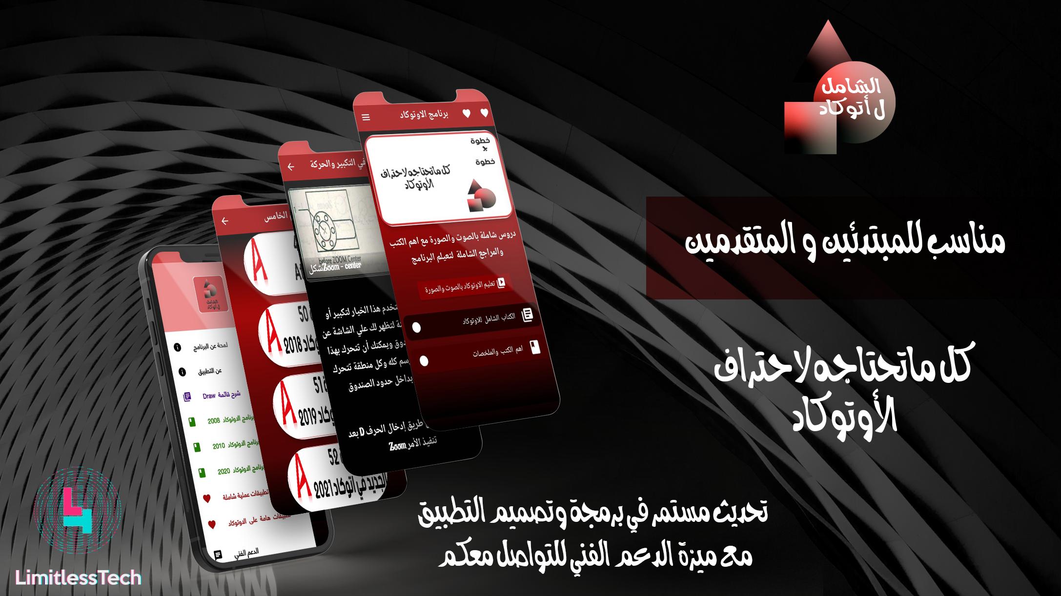 The AutoCAD Explanation application contains everything you need to learn the AutoCAD program step by step from scratch to reach full professionalism through a series of clear educational videos in Arabic, along with a large and renewed number of books, summaries and practical applications to facilitate you learning the AutoCAD program