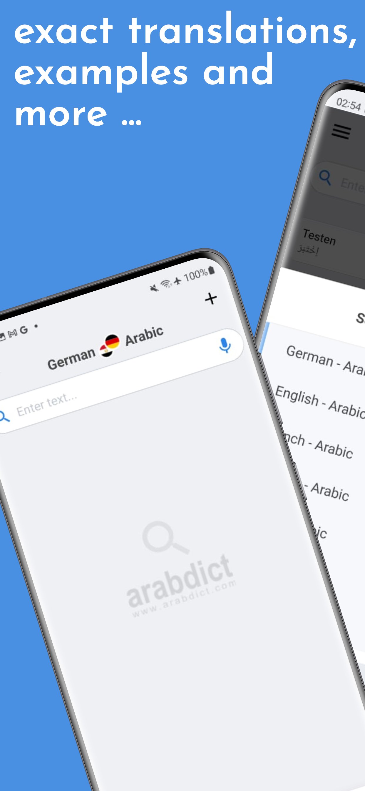 The app includes arabdict dictionaries for Arabic, German, English, French, Italian, Spanish,Portuguese, Dutch, Polish, Hungarian, Danish, Ukrainian, Kurdish, Finnish, Greek, Czech, Farsi, Swedish and Turkish.