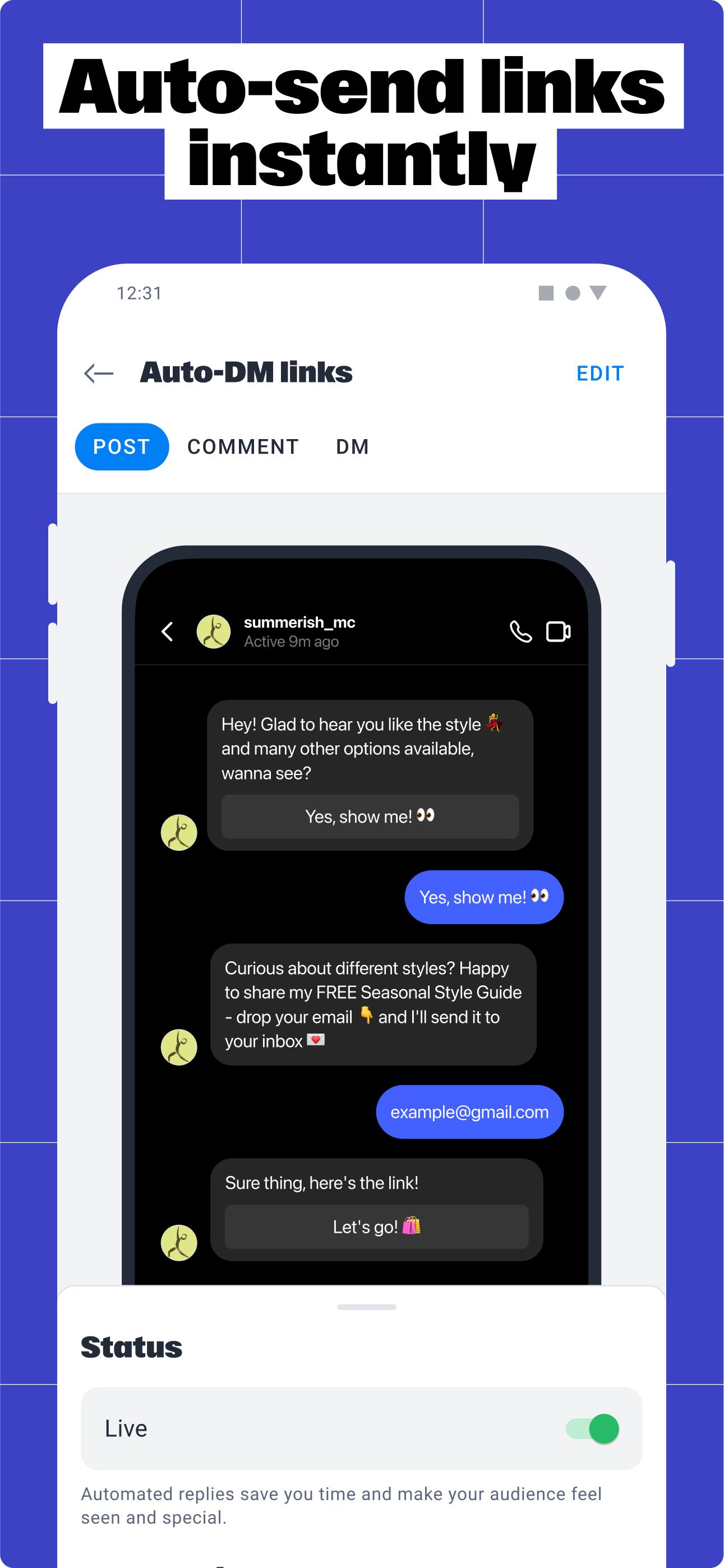 Manychat is your all-in-one automation tool to stay personal at scale, never miss a message, and convert social engagement into sales — right from your phone. We work with Instagram, WhatsApp, Facebook Messenger,