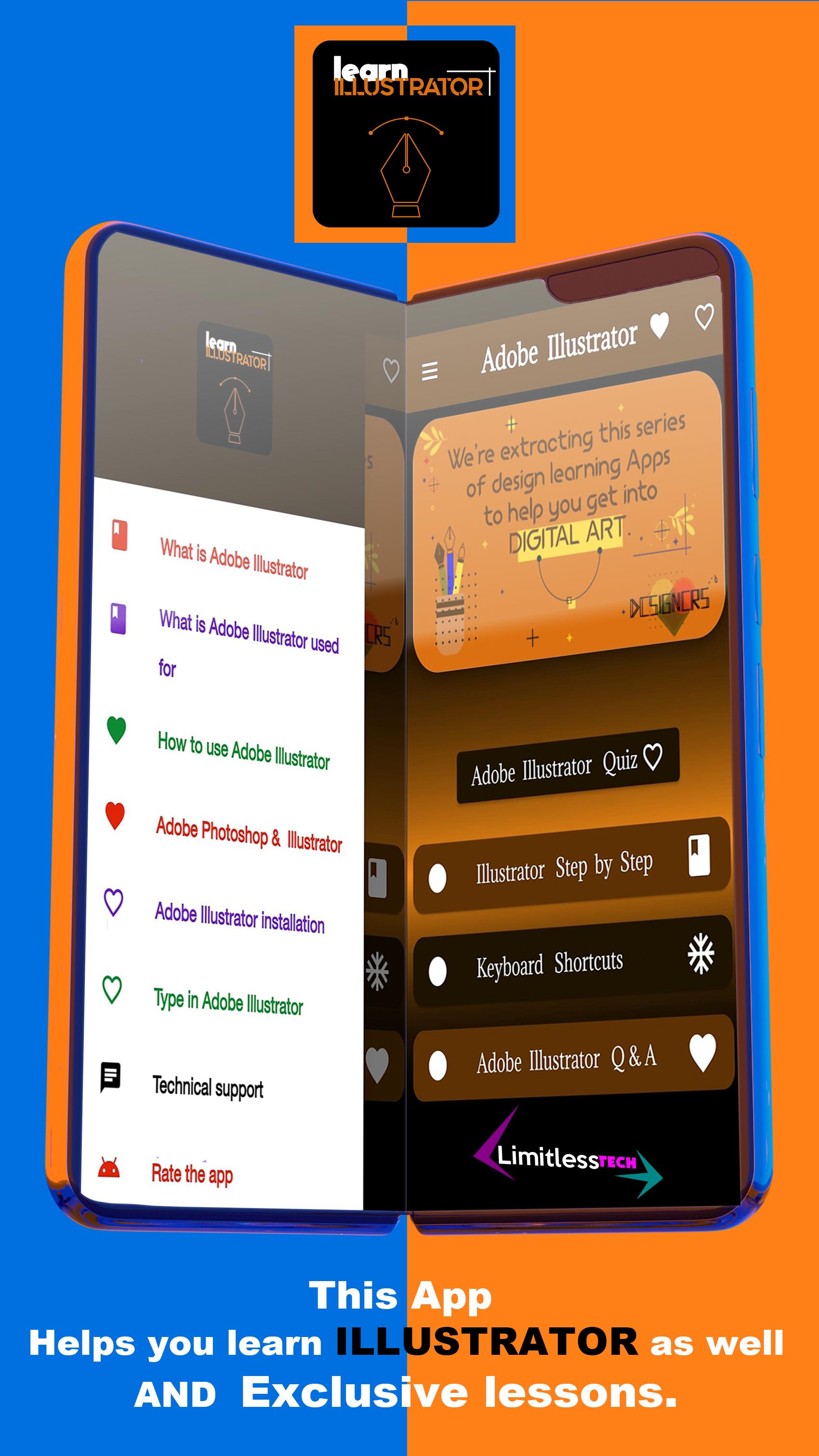 Learn Illustrator is the first app of this series, which contains a large number of lessons, questions, answers and renewable tests for all you need in Illustrator to reach you to full professionalism.