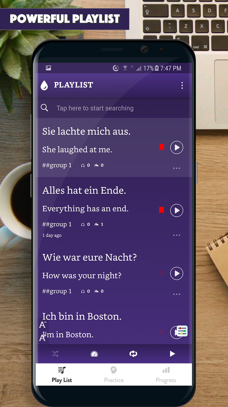 All the app's features are designed to help you learn to make German sentence and improve the main skills: Listening to a sentence, writing (making) a sentence correctly, speaking a sentence/a phrase correctly.