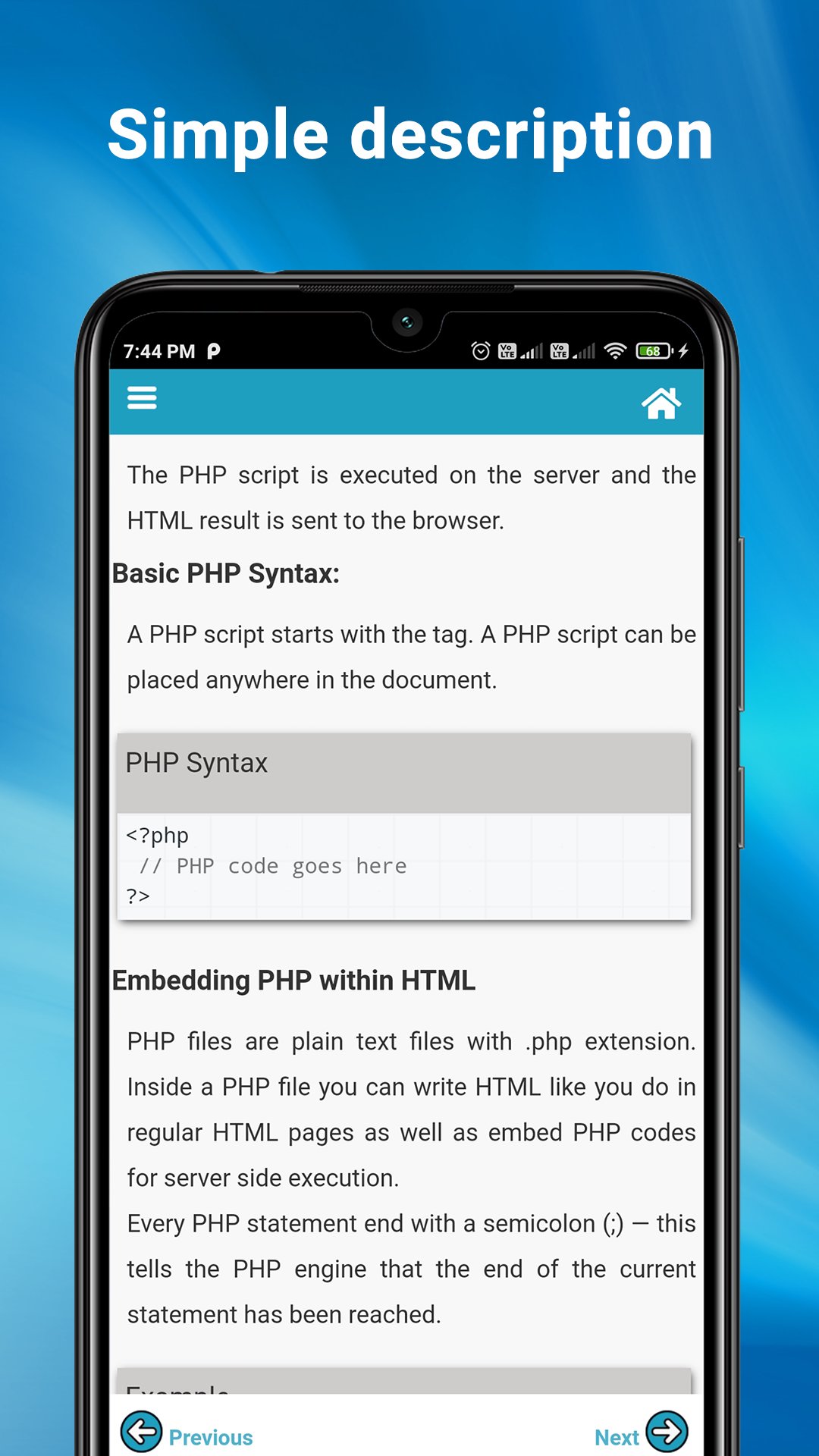 This app contains all the major topics of PHP 8 with Excellent Code Examples. We constantly update this app with every new major PHP release and add more code snippets and examples. This PHP Tutorial Offline App Is Helpful To All Students And Developers To Keep Hand Book Of PHP. This PHP Offline Tutorial Help You To Learn PHP In A Greatly Improved Environment With More Lessons, Real Practice Opportunity, And Community Support, Learn Each Lesson With Real Examples. PHP Tutorial Offline App is a Complete Offline Guide Through PHP. You Can Learn Very Basic Fundamentals Of PHP To An Advanced Level Of PHP In Step By Step.