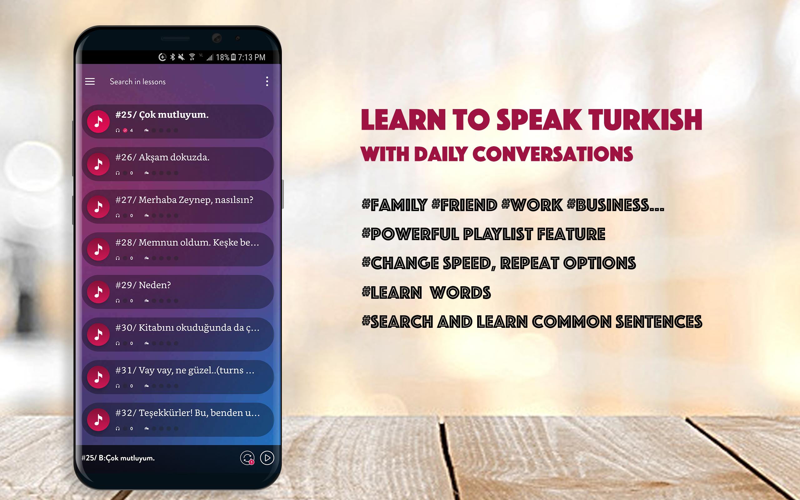 Learn to speak Turkish through hundred of real-life conversation dialog is the most effective way to learn Turkish. Emphasize listening, the app helps you to improve your listening skill, pronunciation, know how to ask and answer in daily talking.