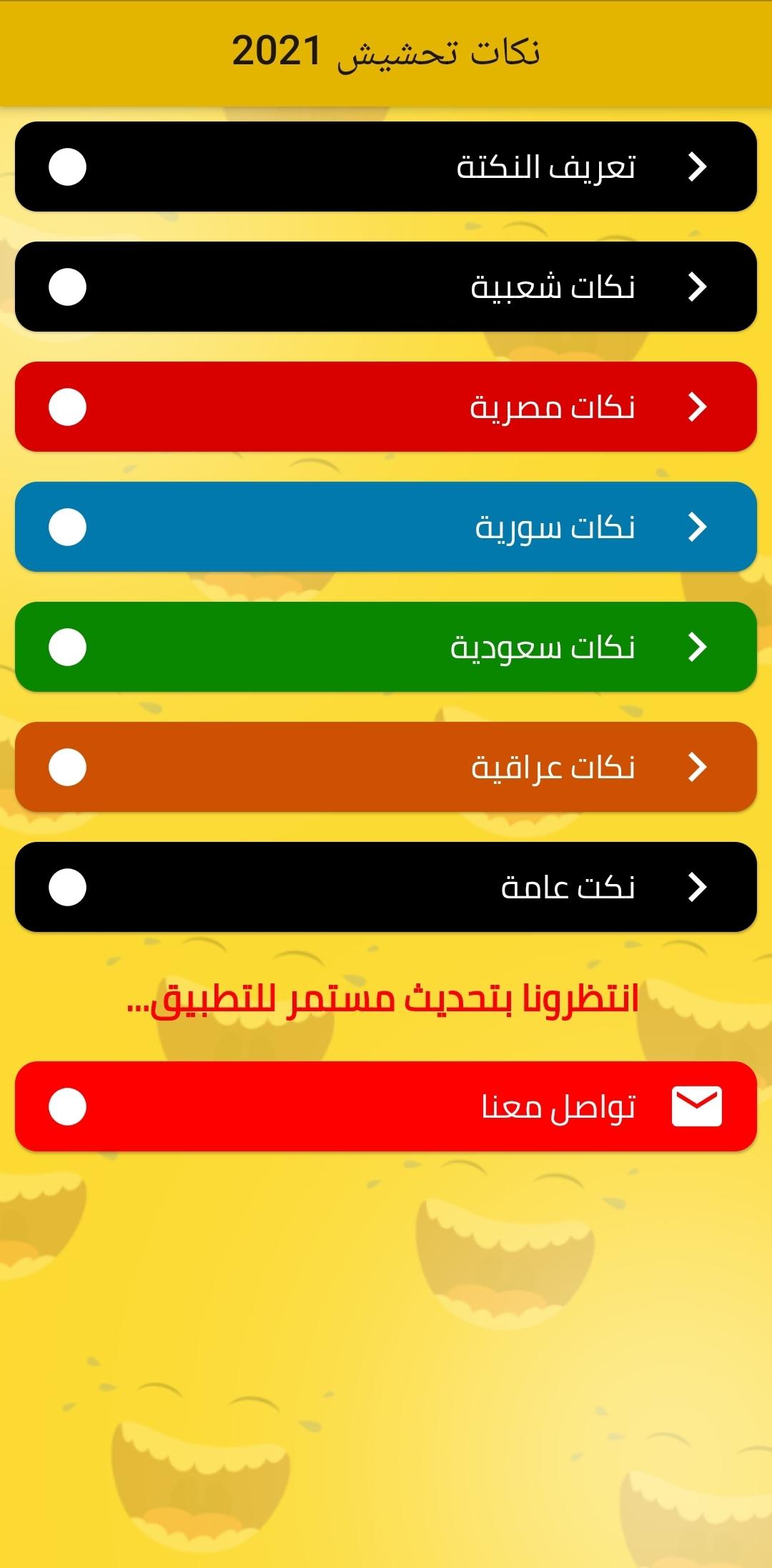 ويحتوي التطبيق ايضا على نكات متنوعة، نكات مصرية، نكات سعودية، نكات سورية، نكات عراقية