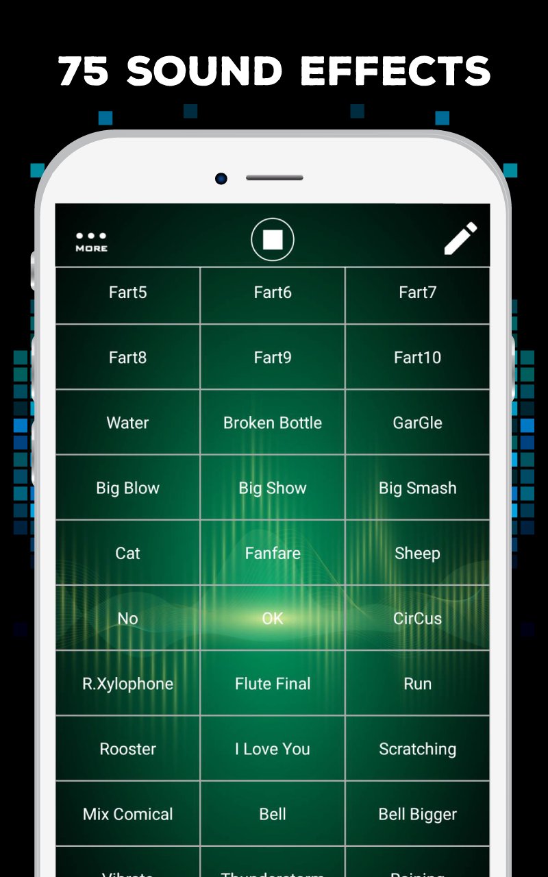 Example sound effect in application : "Scratching" "Quack Quack", "OH NO!", "Kiss", "Fart Sound", "Ha Ha Ha", "Cry", "Cow", Gun", "I Love You", "Yee Haa", "Seedy", "Gargle", "Crap", "Sheep", "Mix Comical Sound", "Phone Vibrate", "Thunderstorm", "Raining" etc.