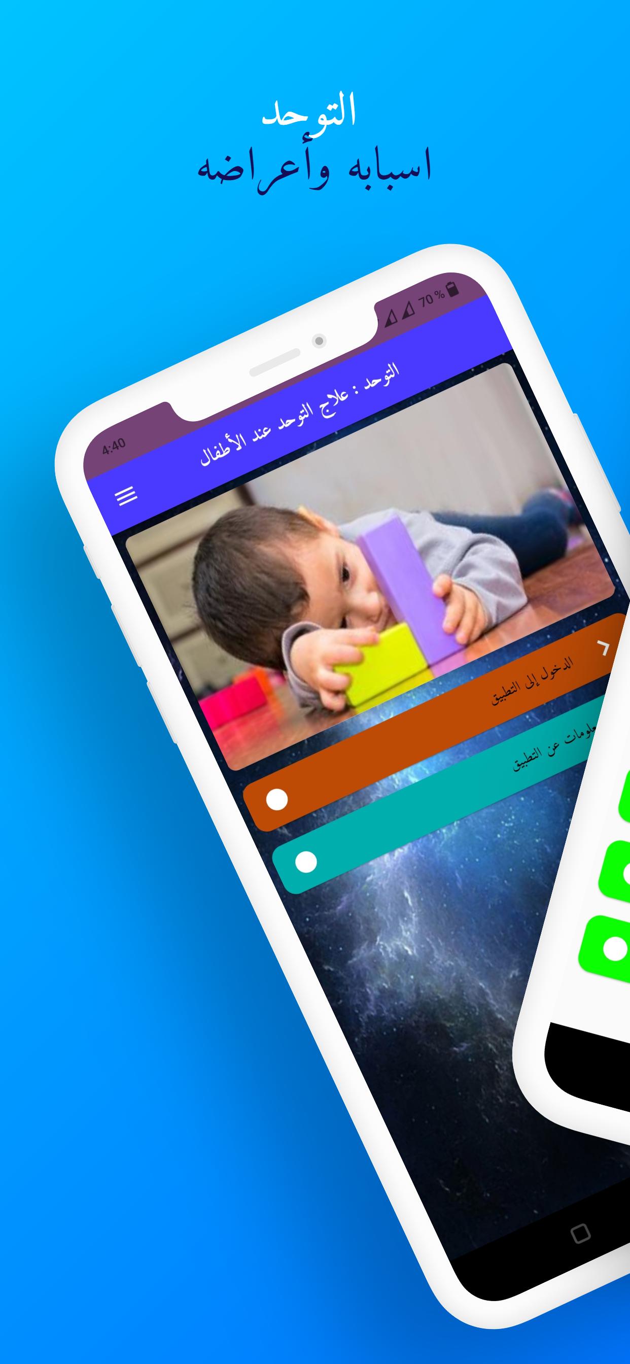 تطبيق علاج التوحد عند الأطفال هو تطبيق يساعدك على تشخيص أعراض التوحد إذا كانت متواجدة عند طفلك كما أنه يحتوي على طرق العلاجة وكذا الوقاية من التوحد عند الأطفال.