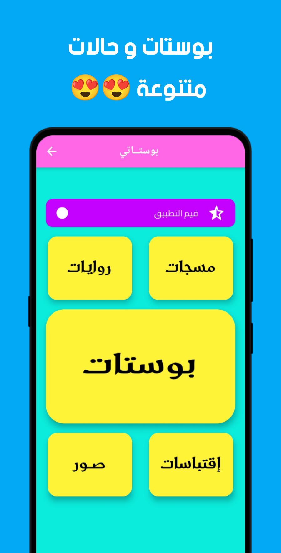 تطبيق بوستات 2021 بدون نت هو تطبيق شامل يغنيك عن باقي التطبيقات يحتوي على كل ما تحتاج مشاركته في مواقع التواصل الإجتماعي مثل فيس بوك و واتس اب و انستا و غيرها و يحتوي على ستاتيات مكتوبة و صور متنوعة و قصص و روايات , اقسام التطبيق :